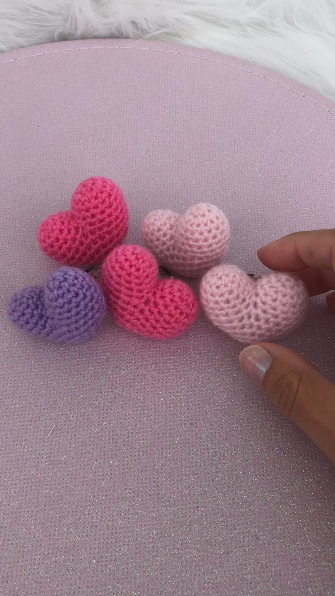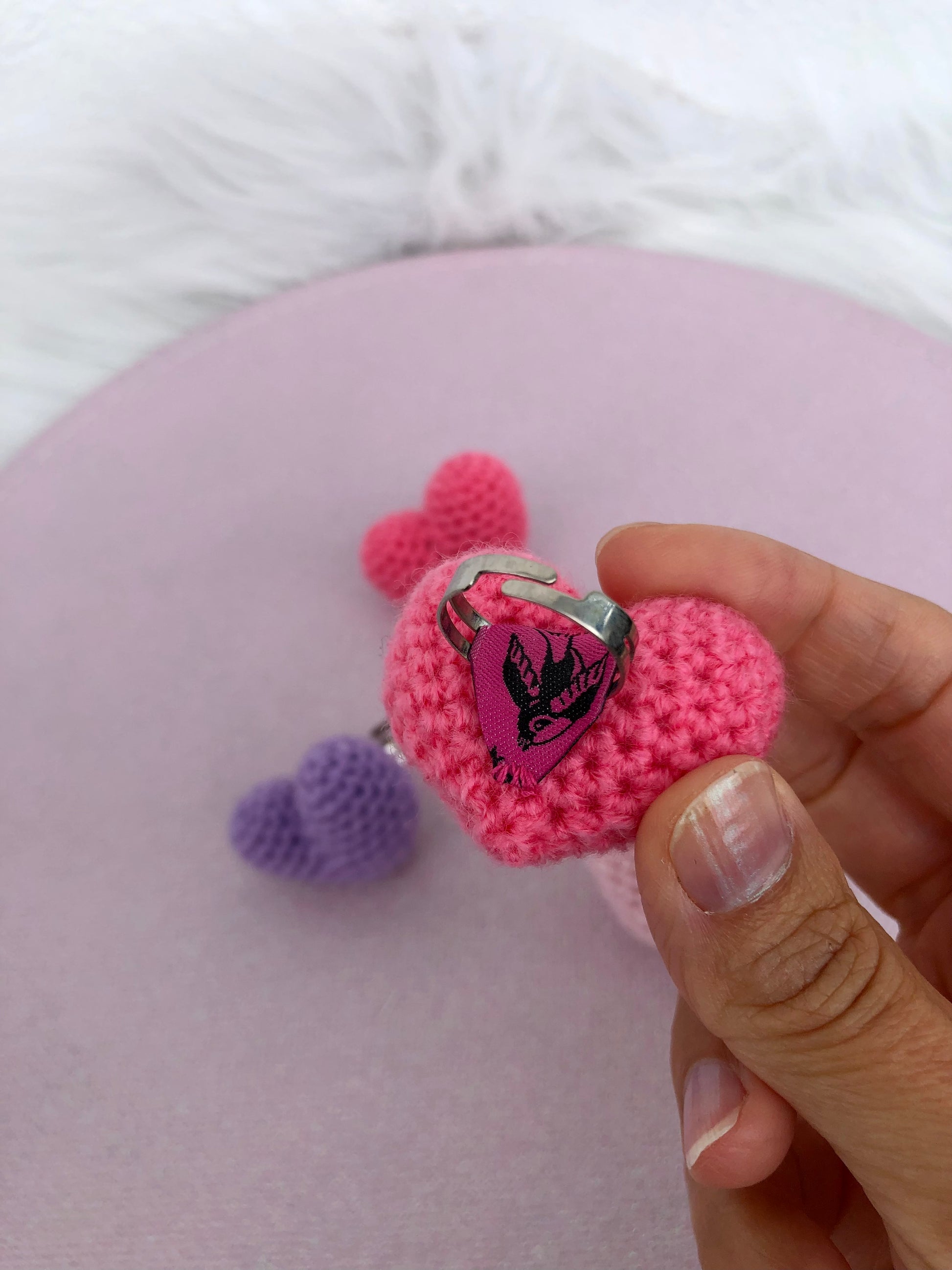 Bague coeur. Réalisée à la main, au crochet. Au couleur de barbie. Rembourrage ouate. Anneau réglable en métal argenté, sans plomb ni nickel.