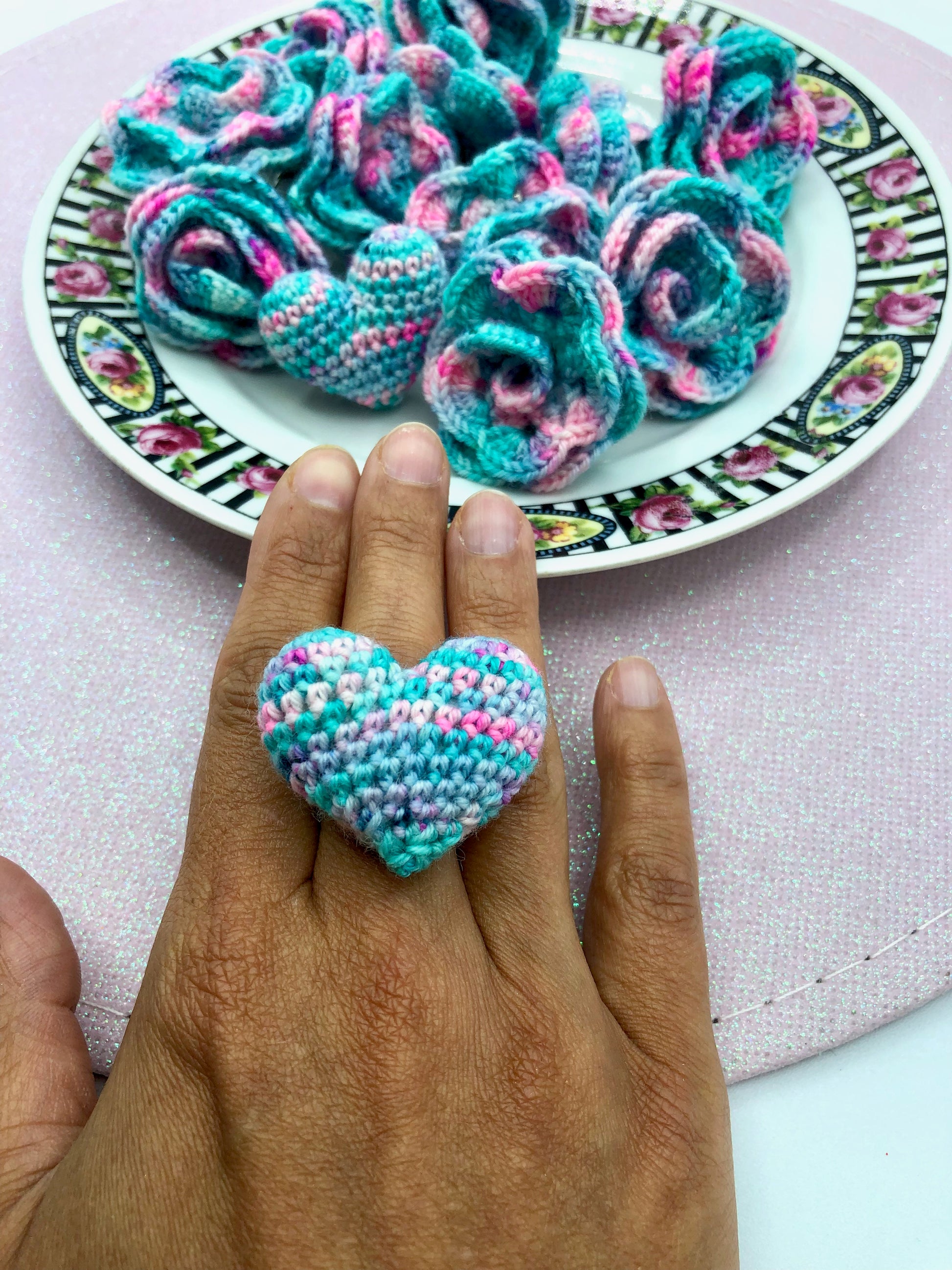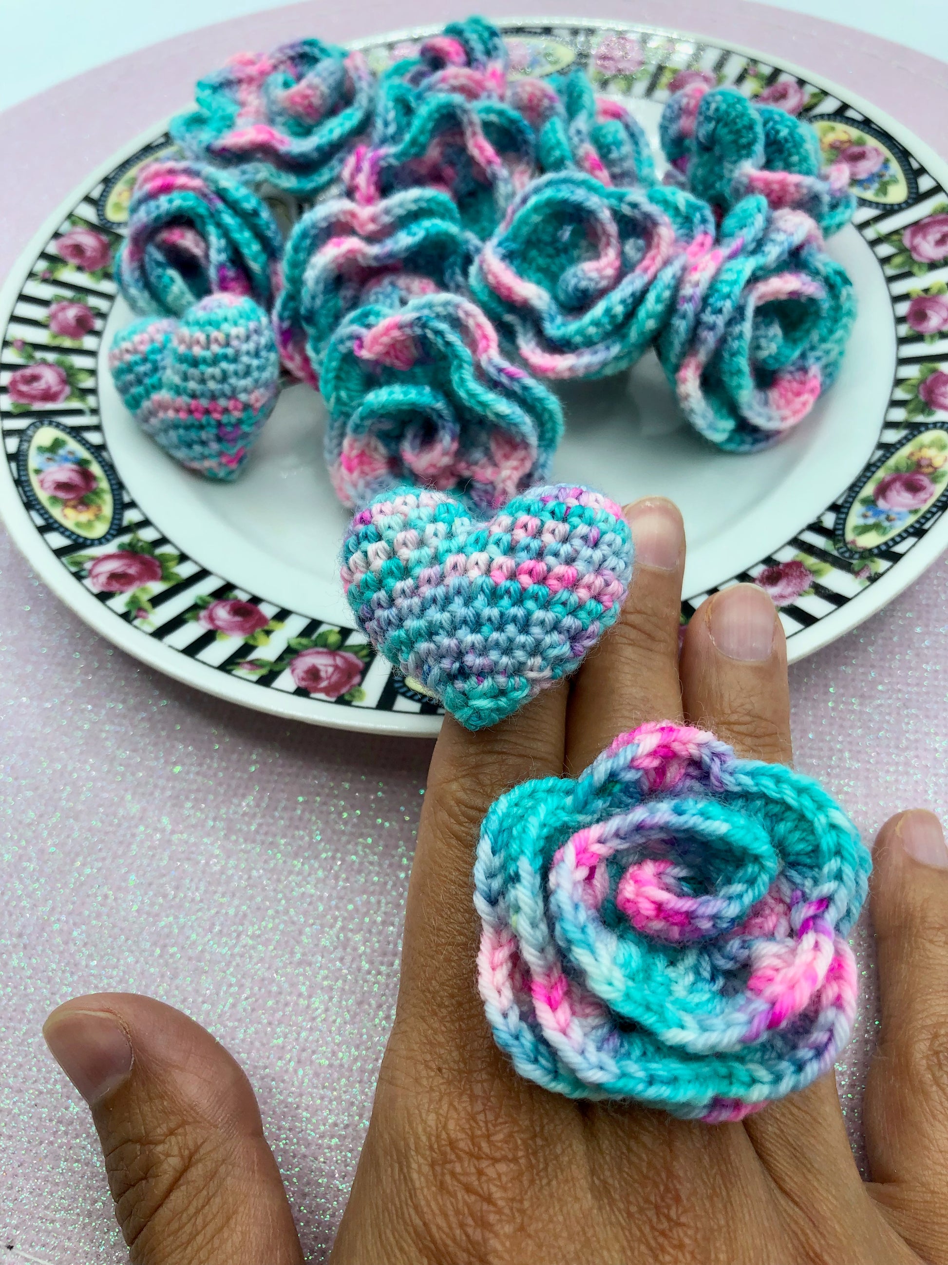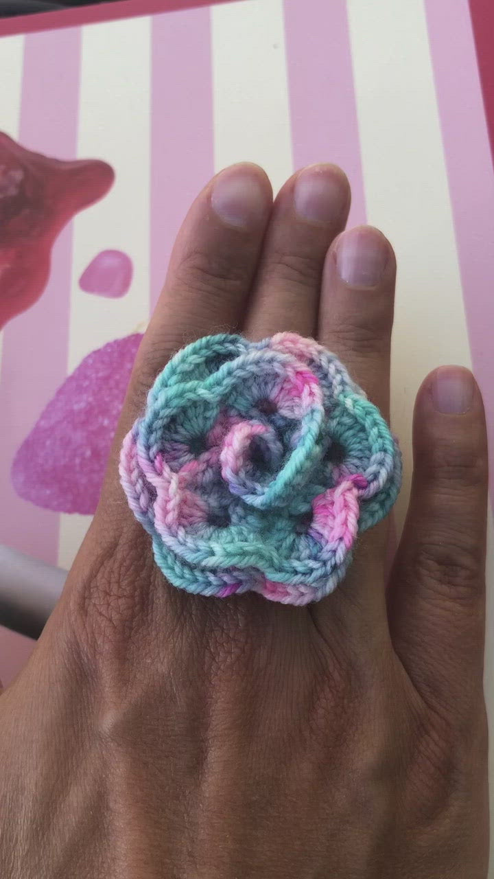 Bague au crochet fleur ou coeur. Laine couleur rose/vert dégradée. rembourrage ouate pour le modèle coeur. Anneau réglable en métal argenté, sans plomb ni nickel.