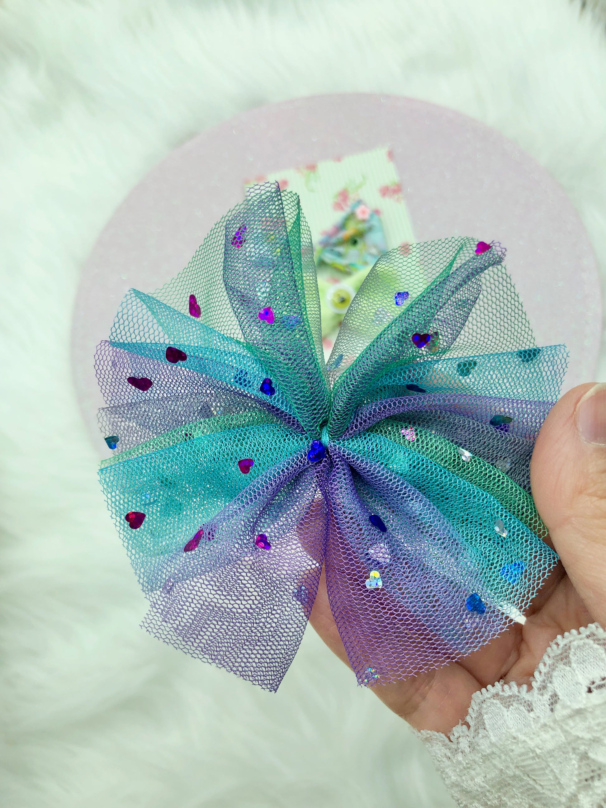 Barrettes pour cheveux inspirées de l'univers de Monstres et Cie. Lot de 3 noeuds. Un en tulle vert/turquoise/violet avec des petits coeurs multicolores, un en tissu 100% coton imprimé Monstres et Cie (avec bob, Sully et Bouh) avec une petite fleur de la porte de Bouh, et un en laine 100% polyamide, tricoté à la main, et au milieu l'oeil mobile de Bob. Pinces crocodiles au dos.