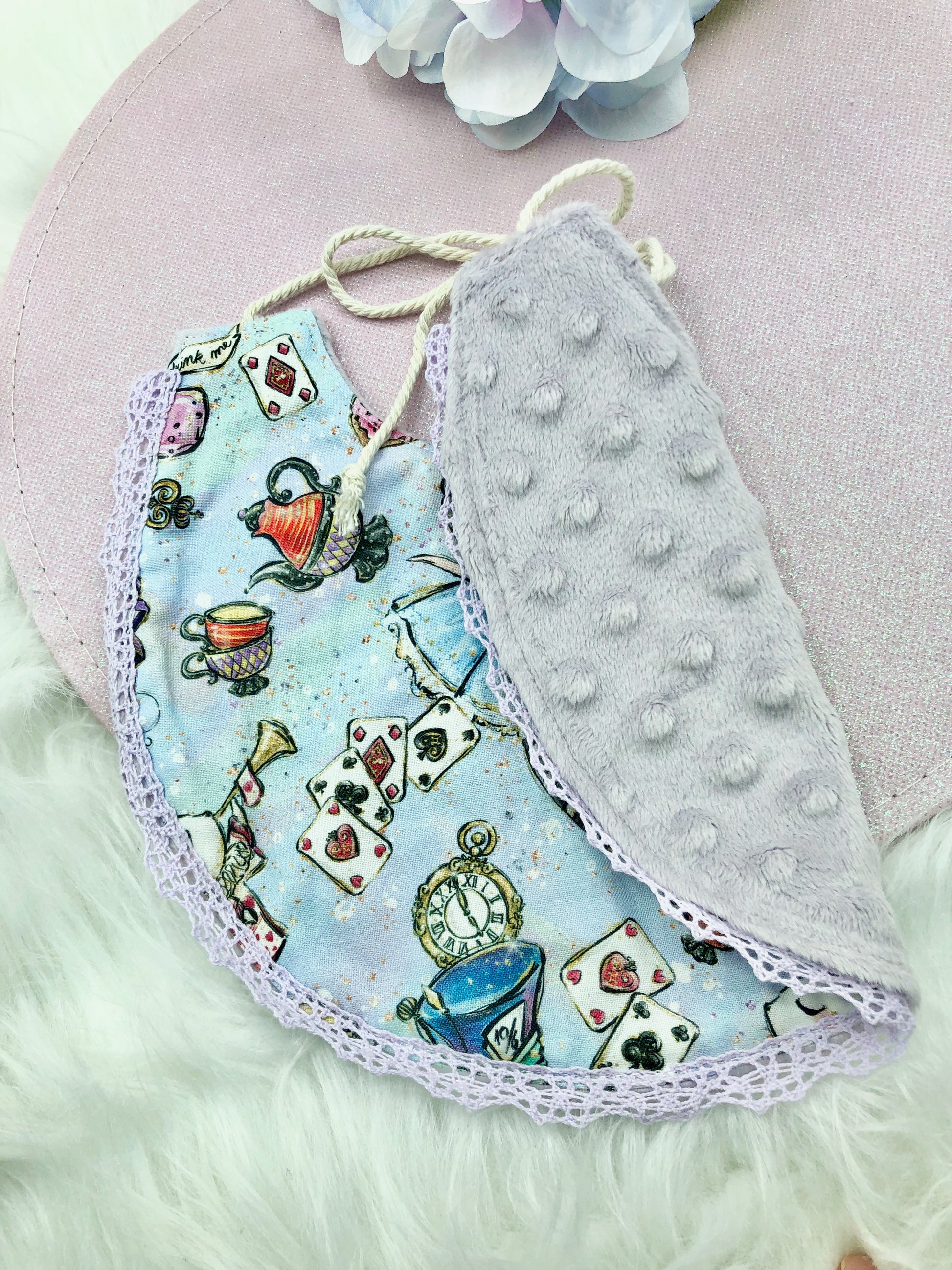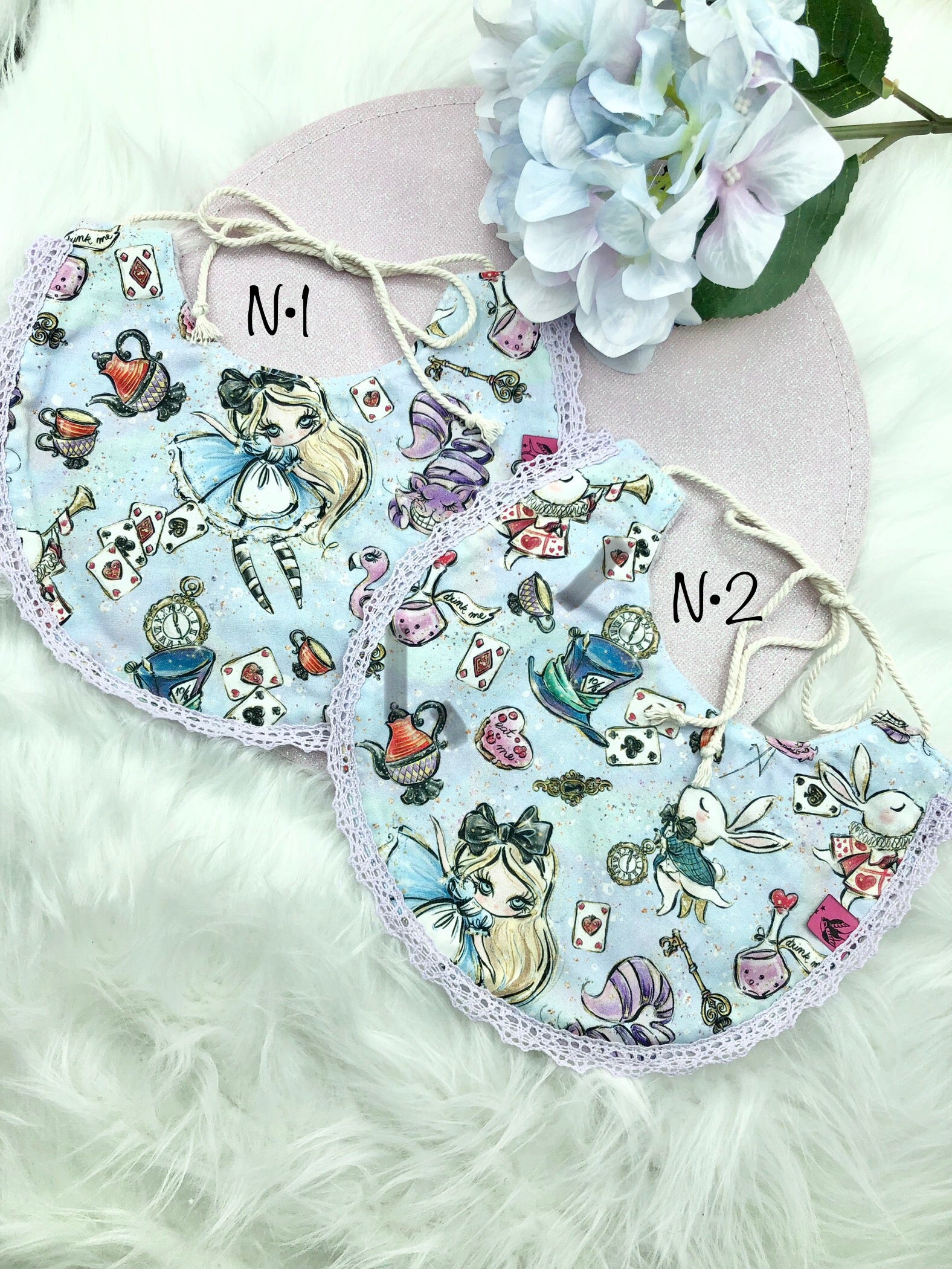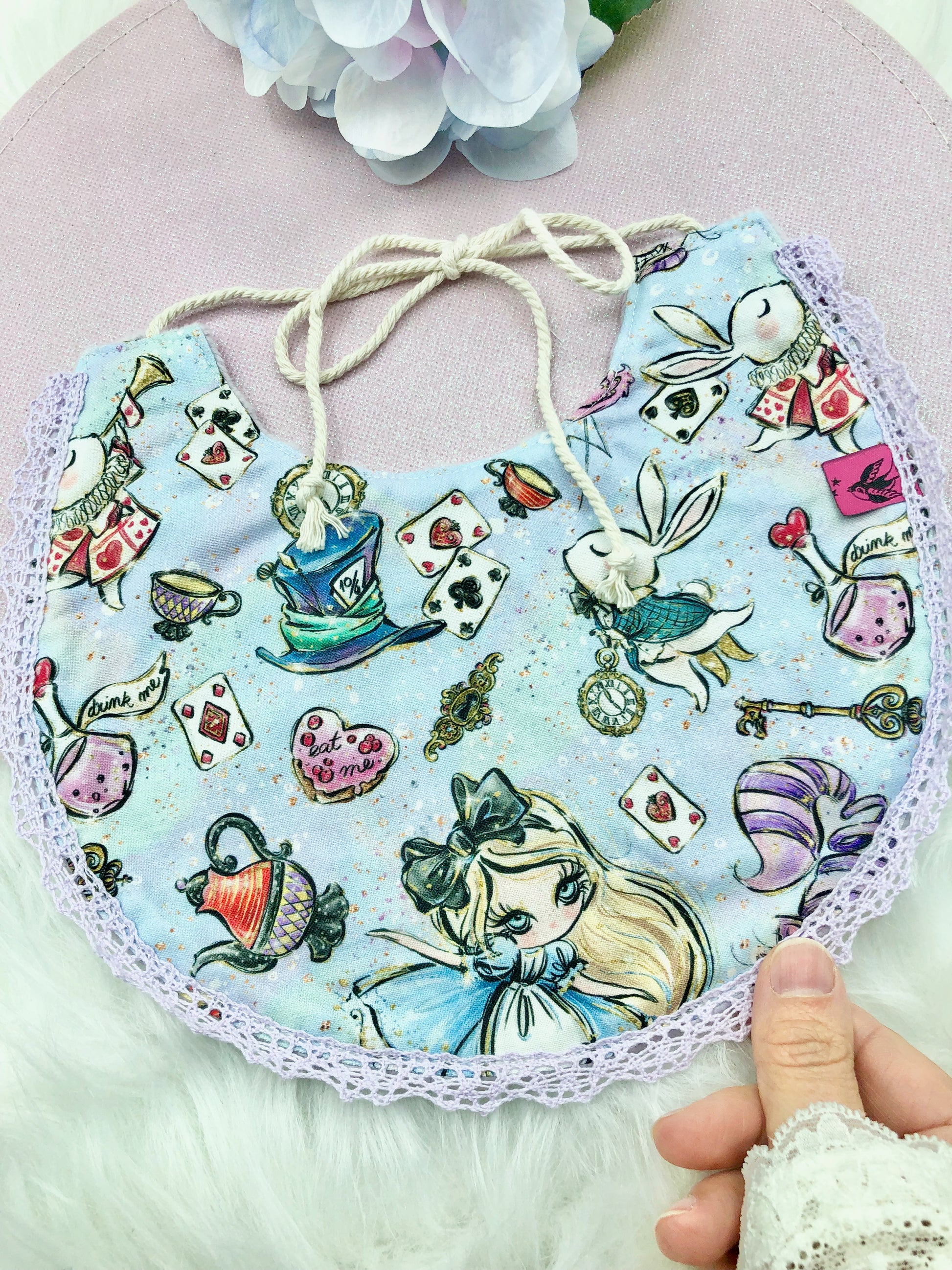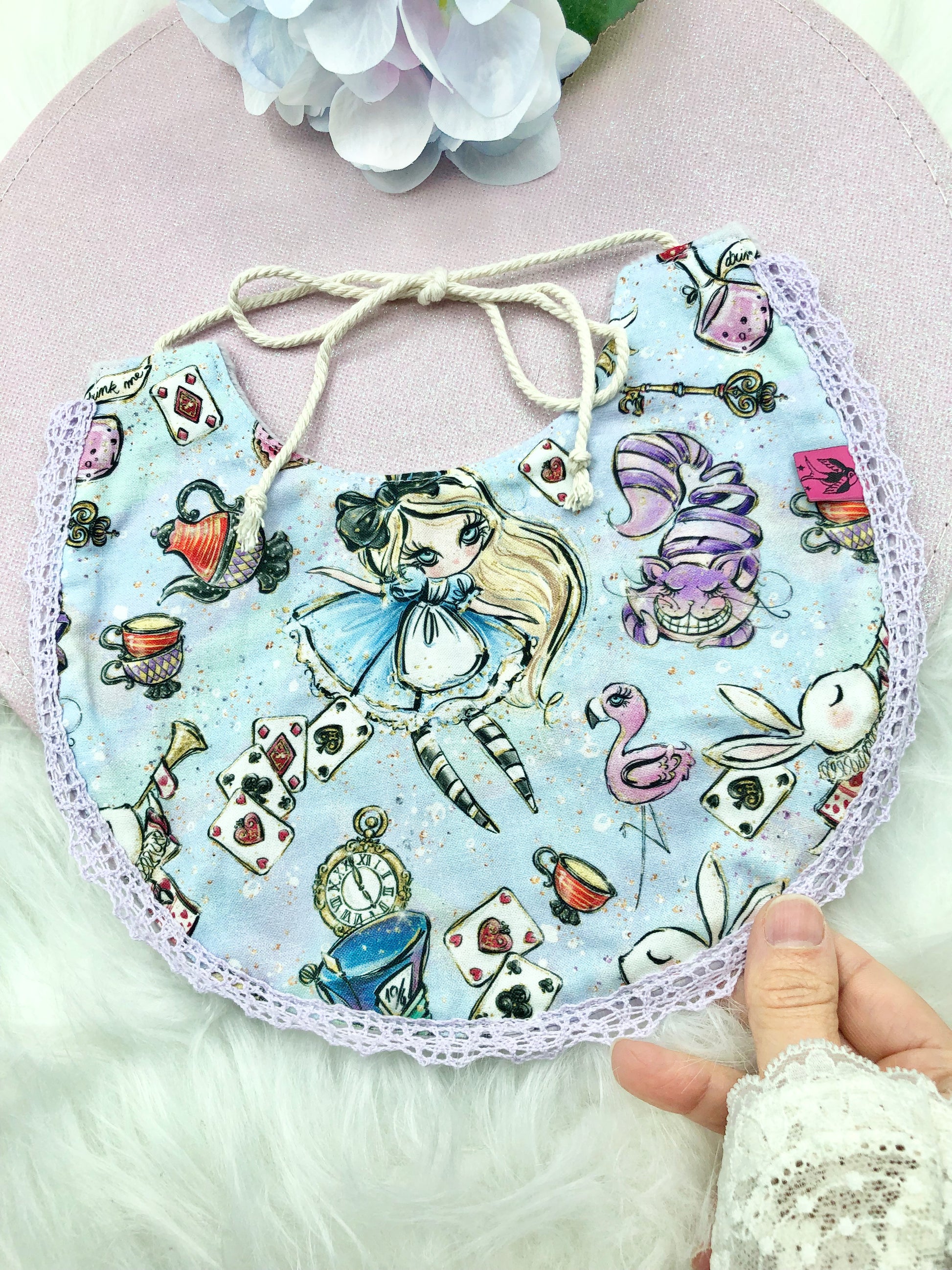 Bavoir pour bébé (taille unique, largeur 22 cm et 14 cm sous le col). Liens à nouer. Un côté en tissu 100 % coton, imprimé Alice aux pays des Merveilles, et l'autre en minky à pois, tout doux, couleur parme. Galon en dentelle cousu en bordure.