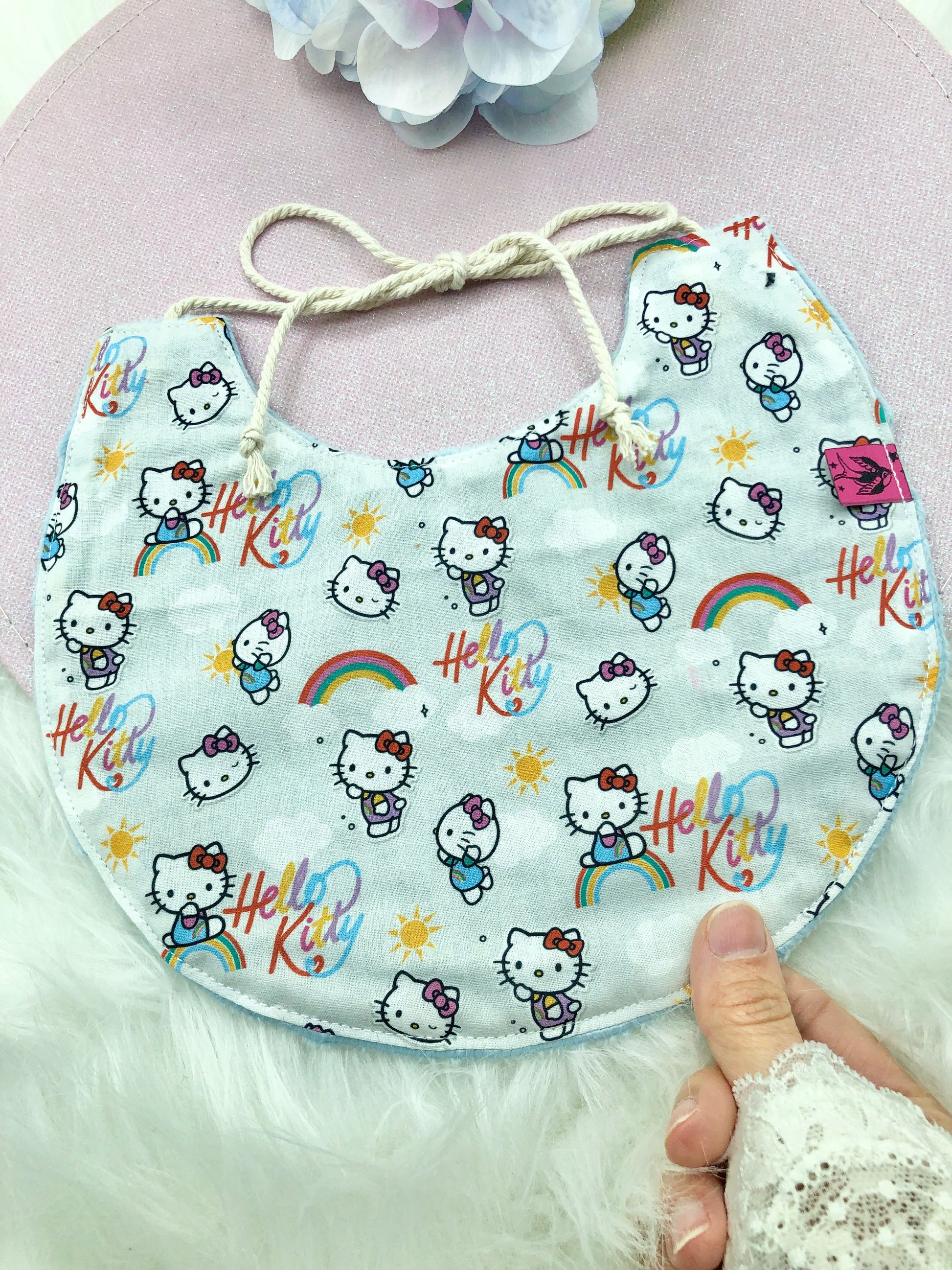 Bavoir pour bébé (taille unique, largeur 22 cm et 14 cm sous le col). Liens à nouer. Un côté en tissu 100 % coton, imprimé Hello Kitty, et l'autre en minky à pois, tout doux, couleur bleu.