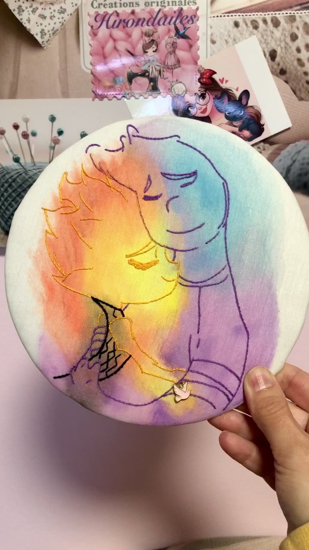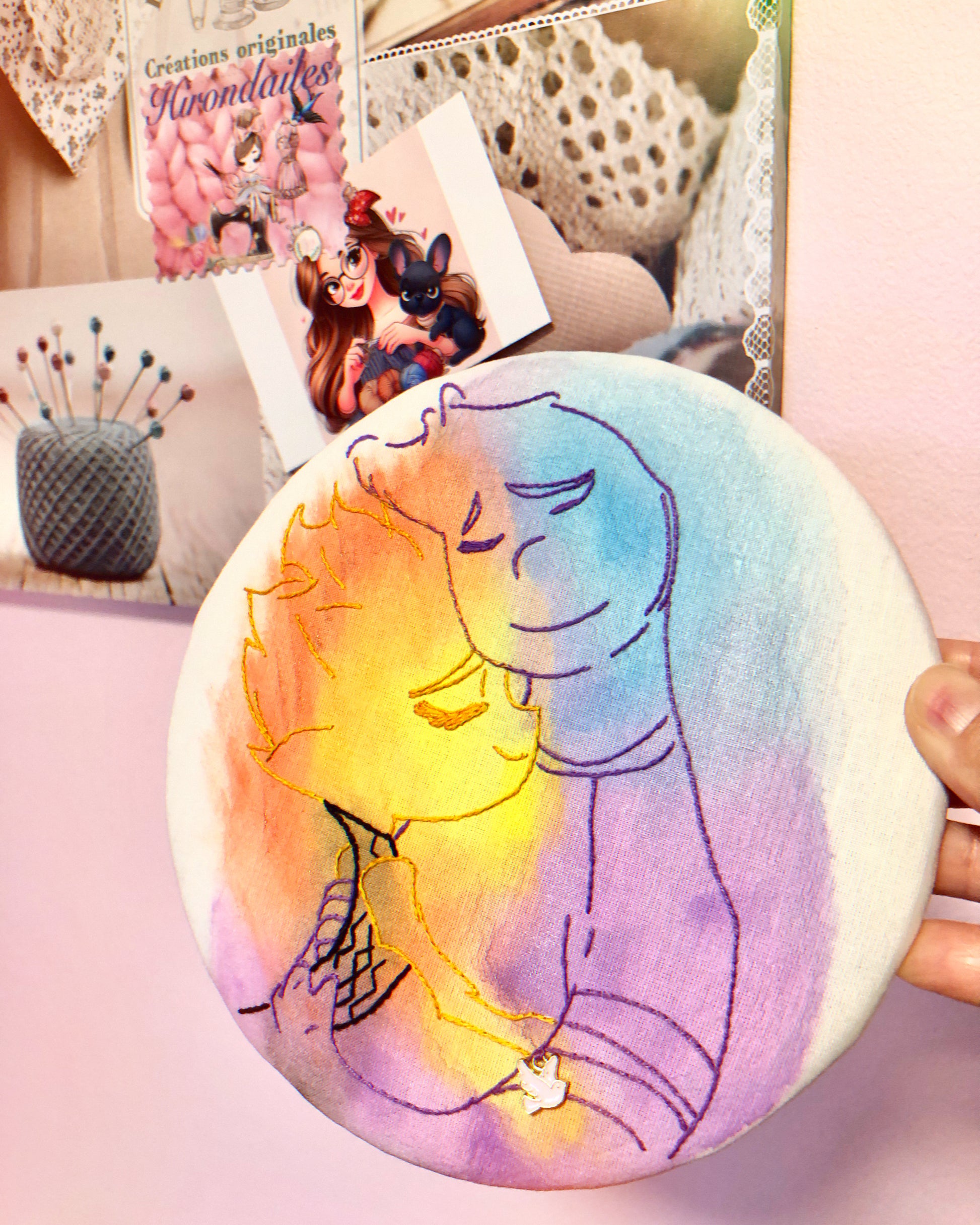 Le fond est réalisé avec de la peinture aquarelle avec quelques petites touches de peinture scintillante. Et les personnages sont brodés à la main.