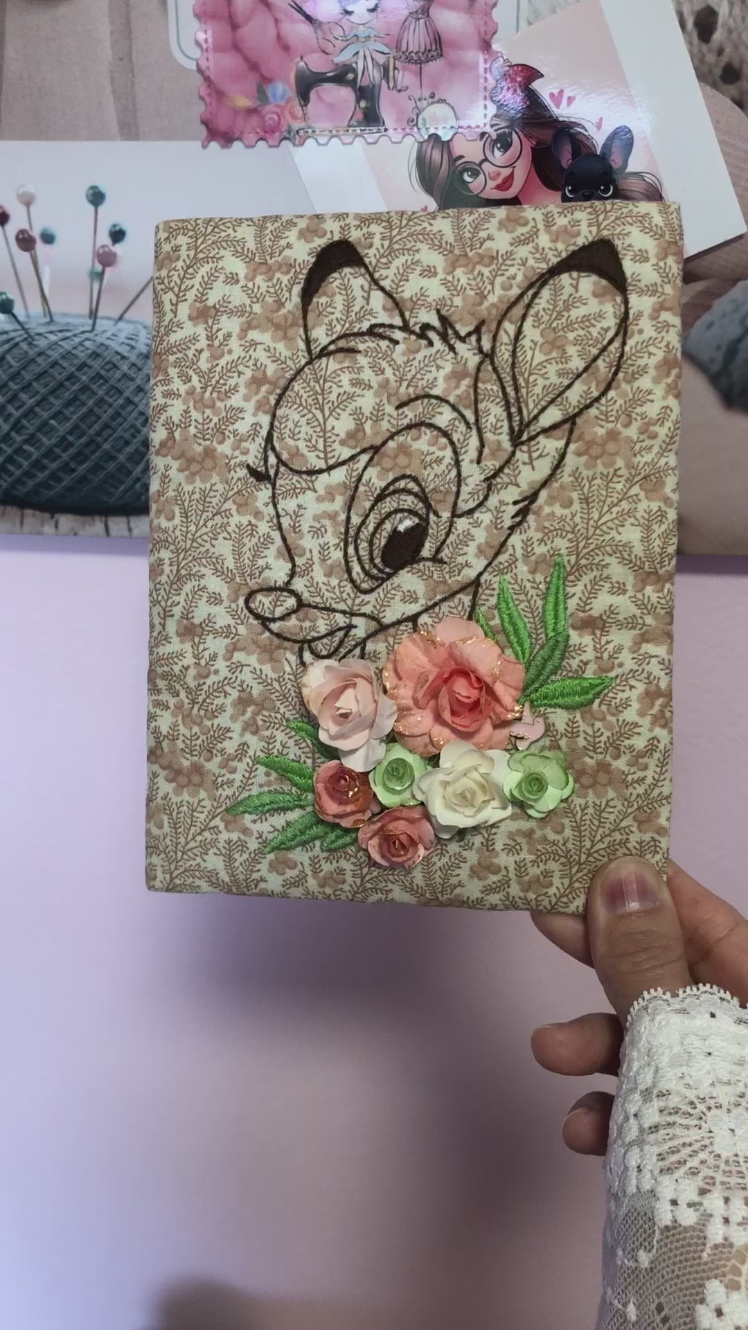 Brodé à la main sur un tissu fleuri. J’ai rajouté des jolies fleurs en papiers.
