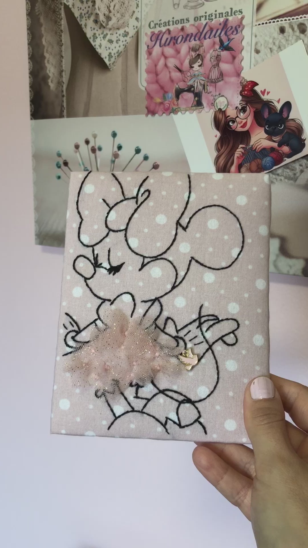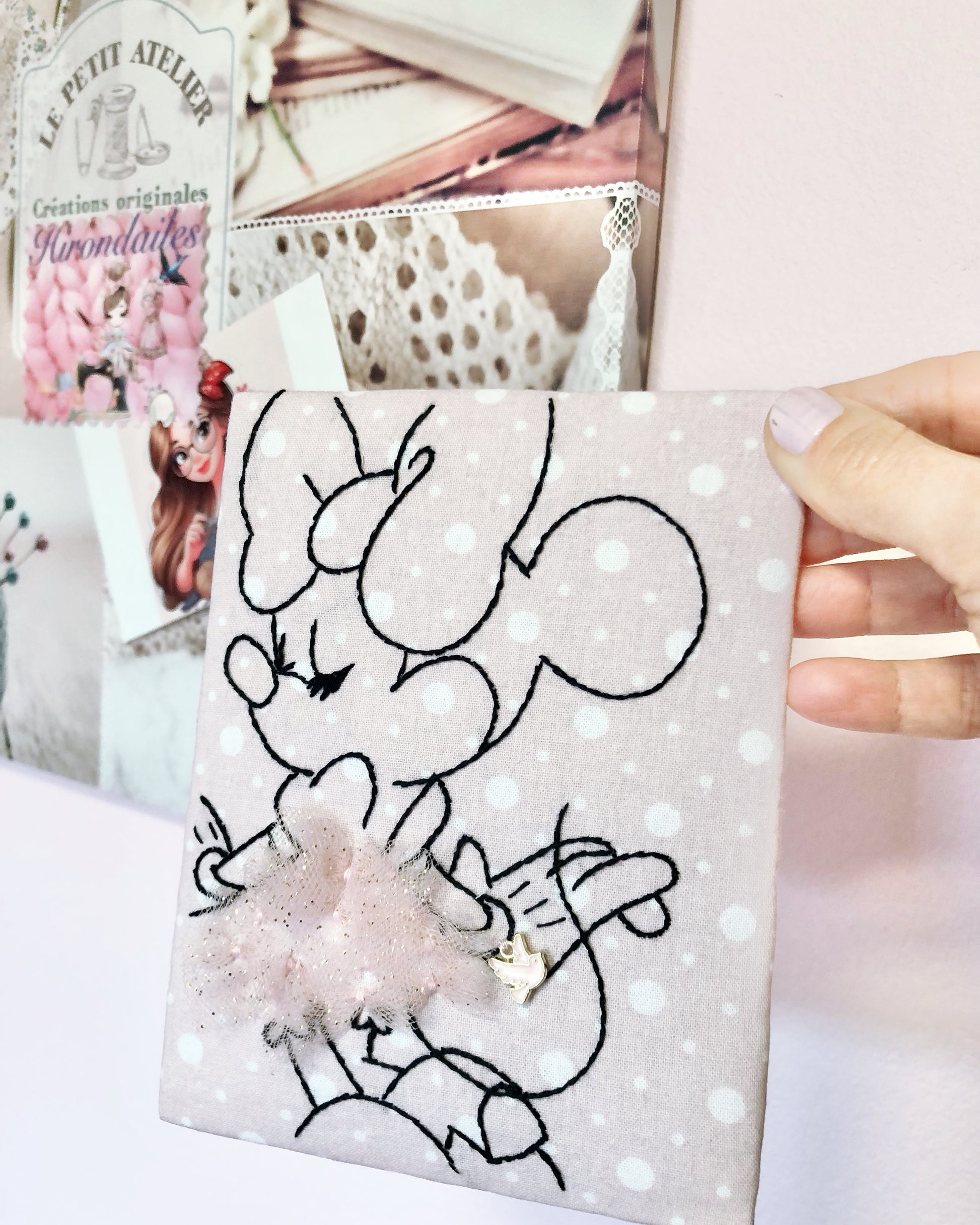 Fixée sur un fond en carton avec une épaisseur de ouatine, ce qui lui donne un effet «moelleux ». Le dos est un joli décor avec l’écriture « Minnie Mouse ».