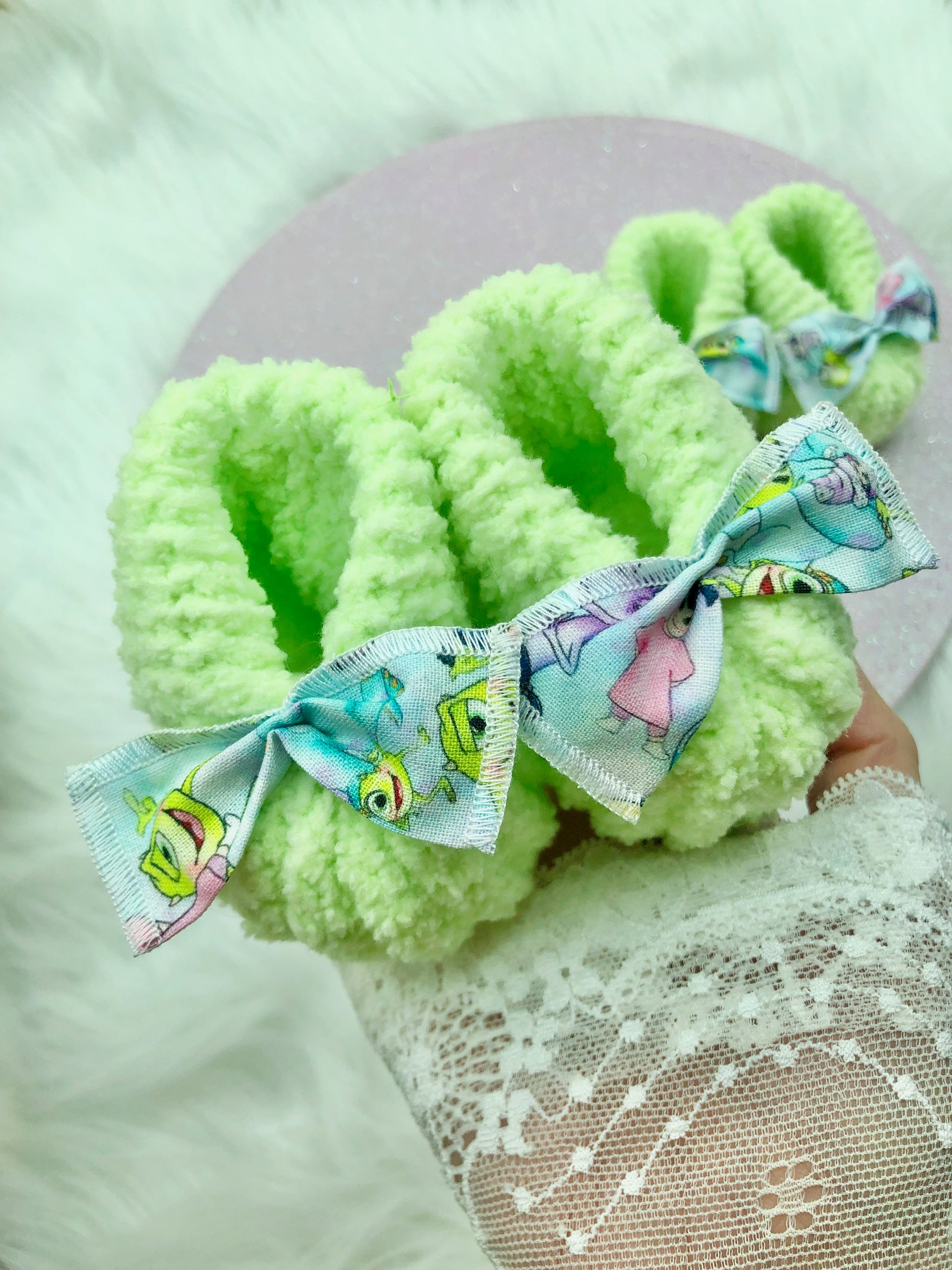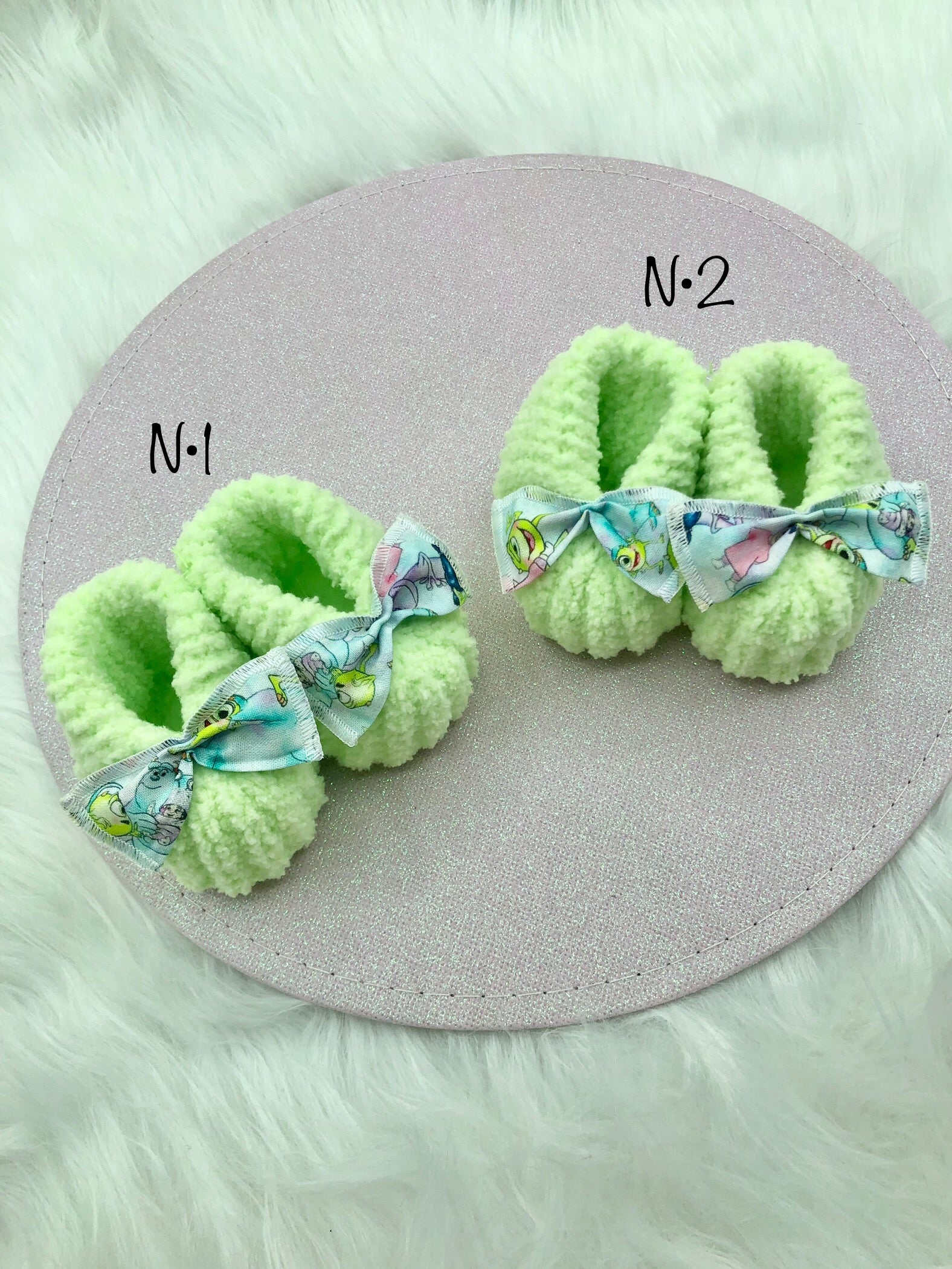 Chaussons de bébé (0-3 mois) tricotés à la main. En laine toute douce, couleur vert pistache 100% polyamide. Noeuds en tissu 100% coton, motif Monstres et Cie. On retrouve Bob, Sully, la petite Bouh et même Léon. Les noeuds sont cousus.