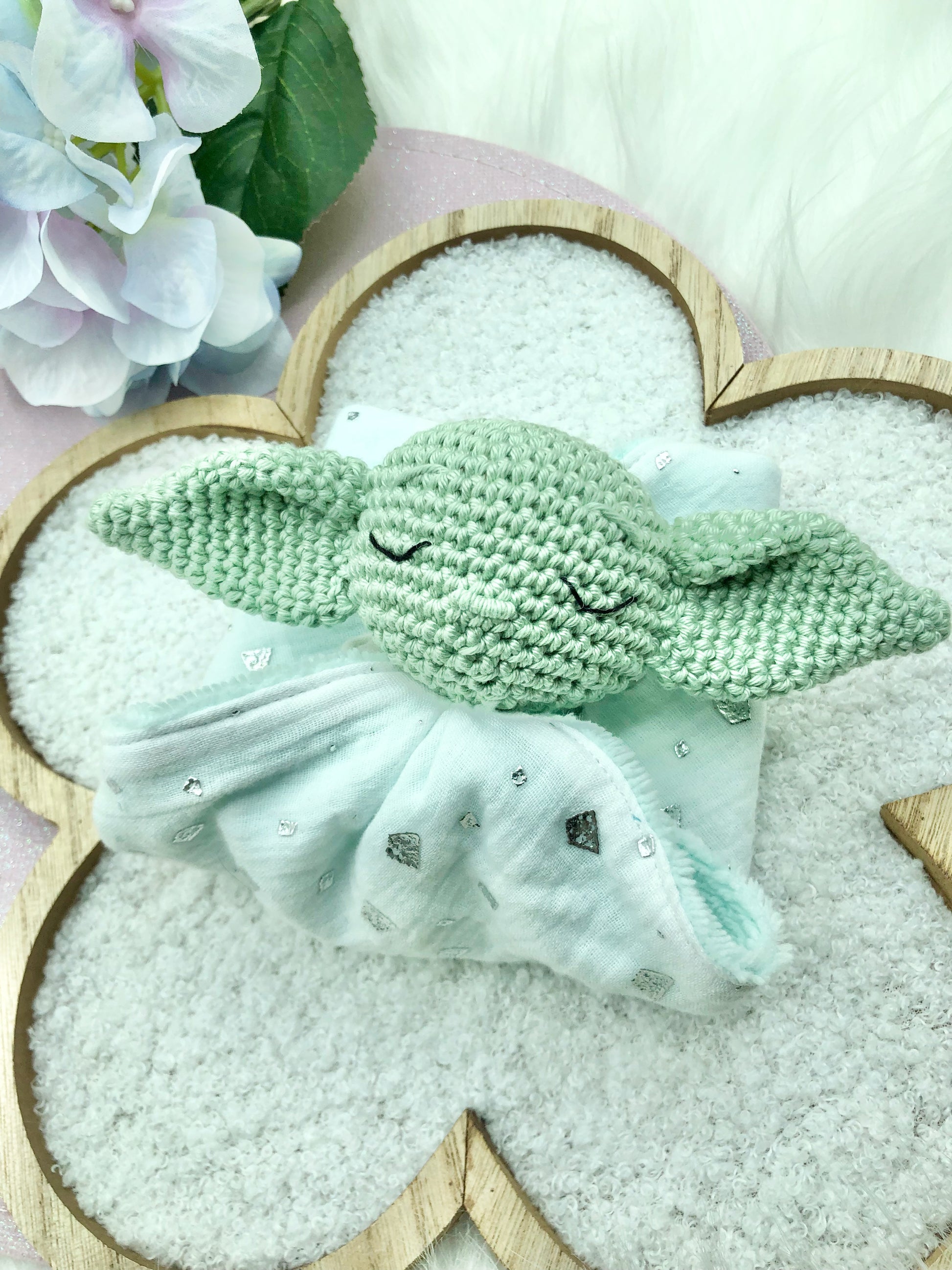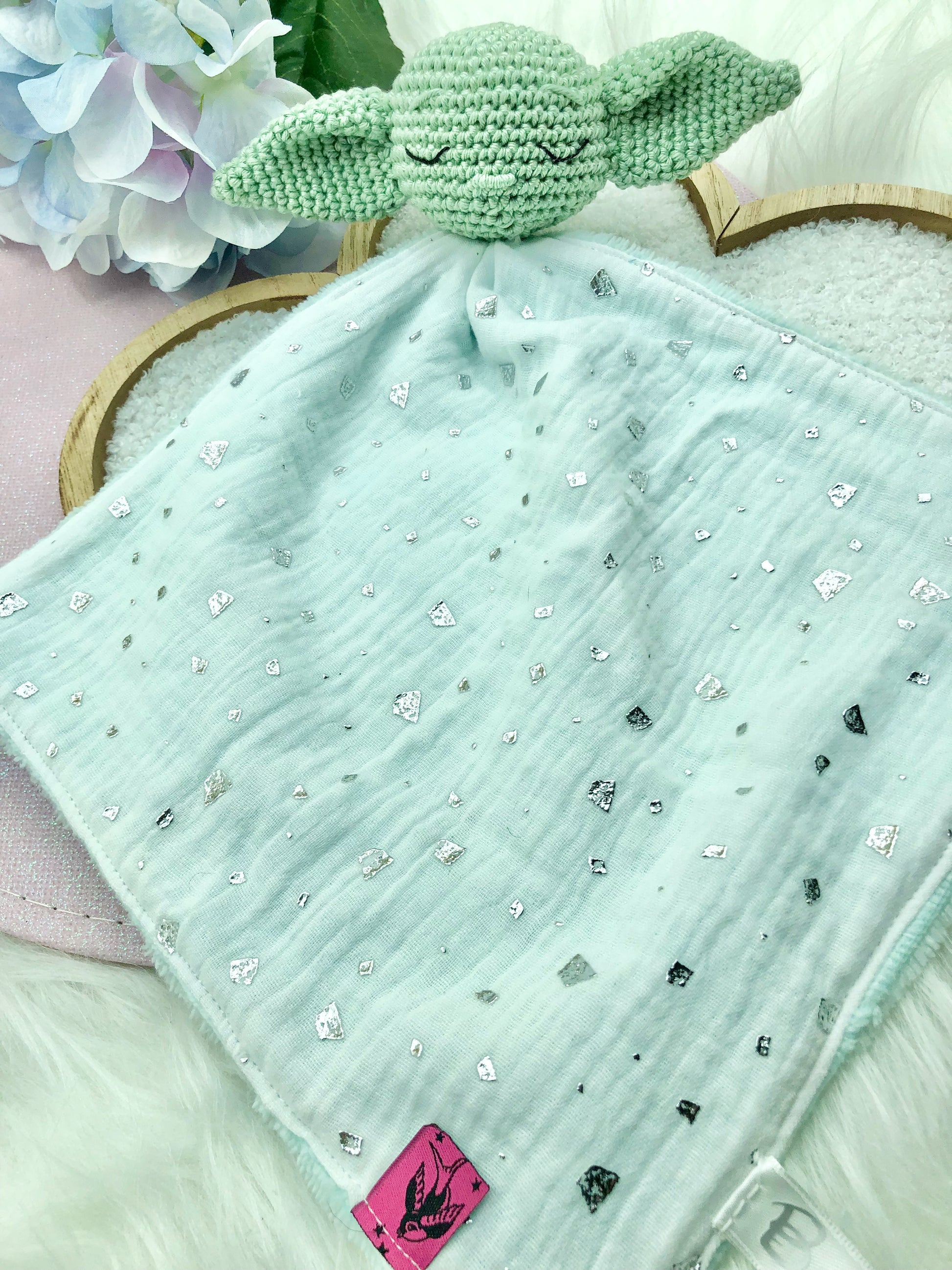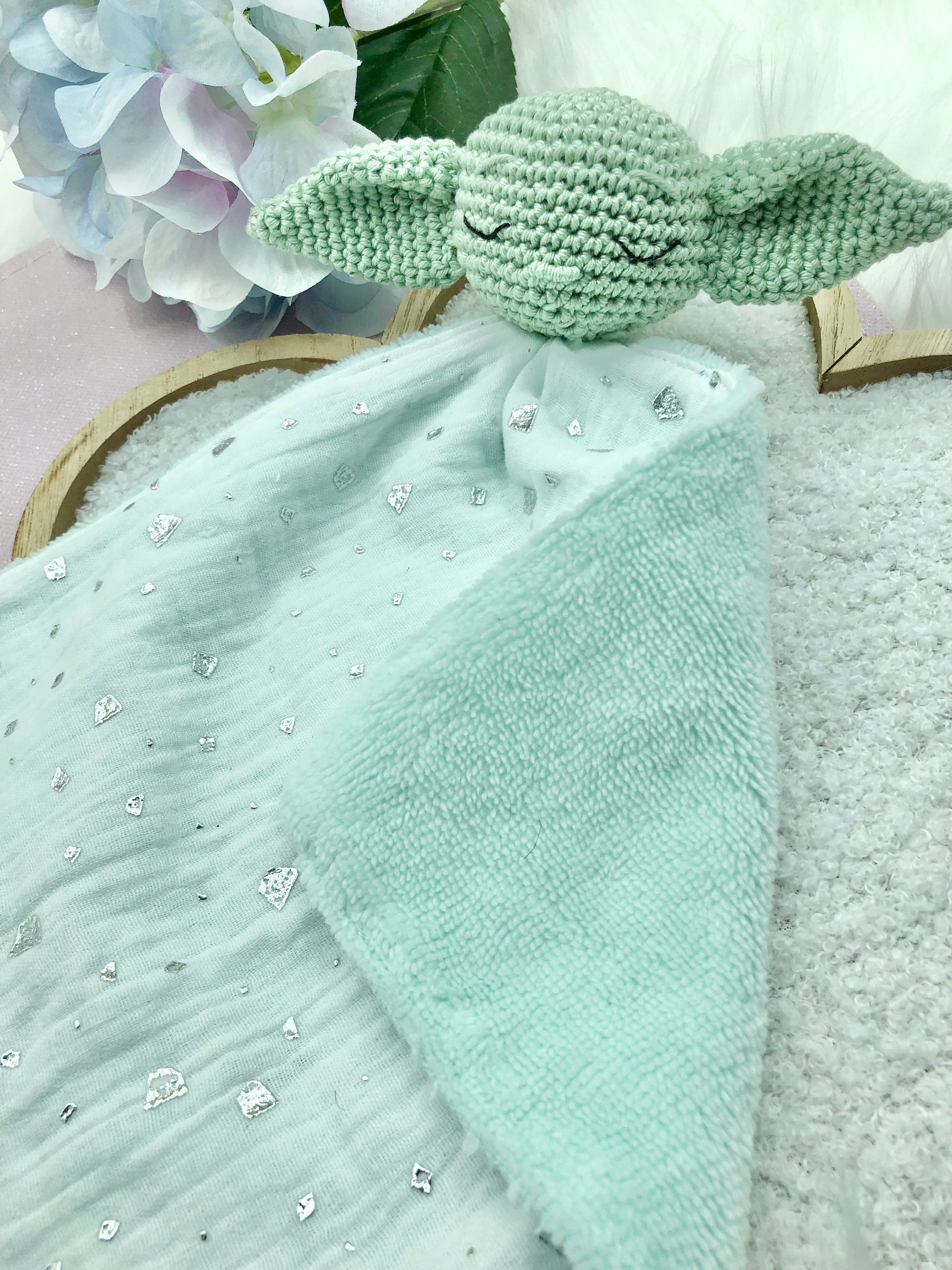 Doudou Grogu endormi. La tête est crochetée à la main, en fil coton. Rembourrage en ouate. Un côté en double gaze coton blanc avec petits détails en argentés et l'autre en éponge bambou vert menthe, toute douce.