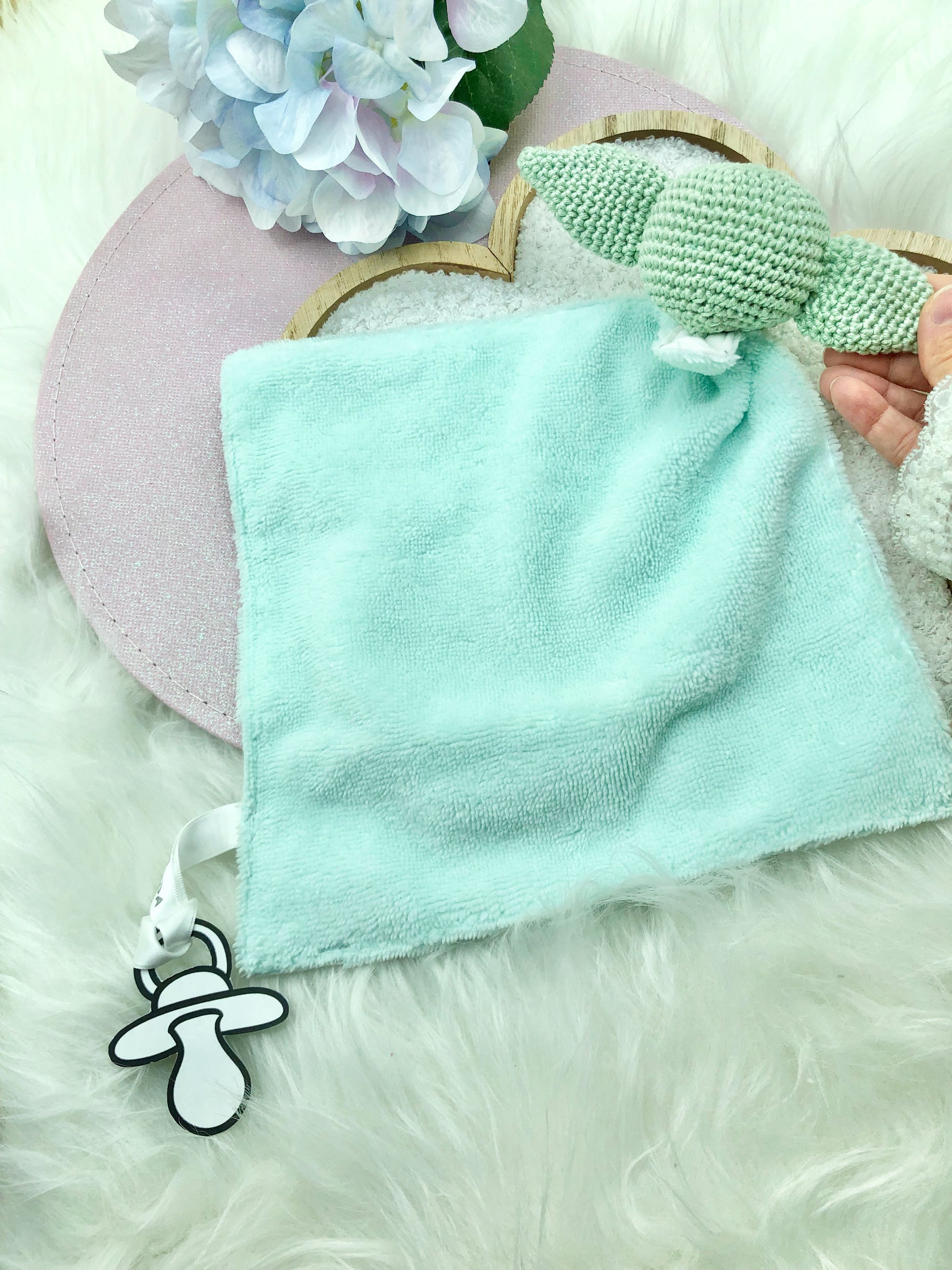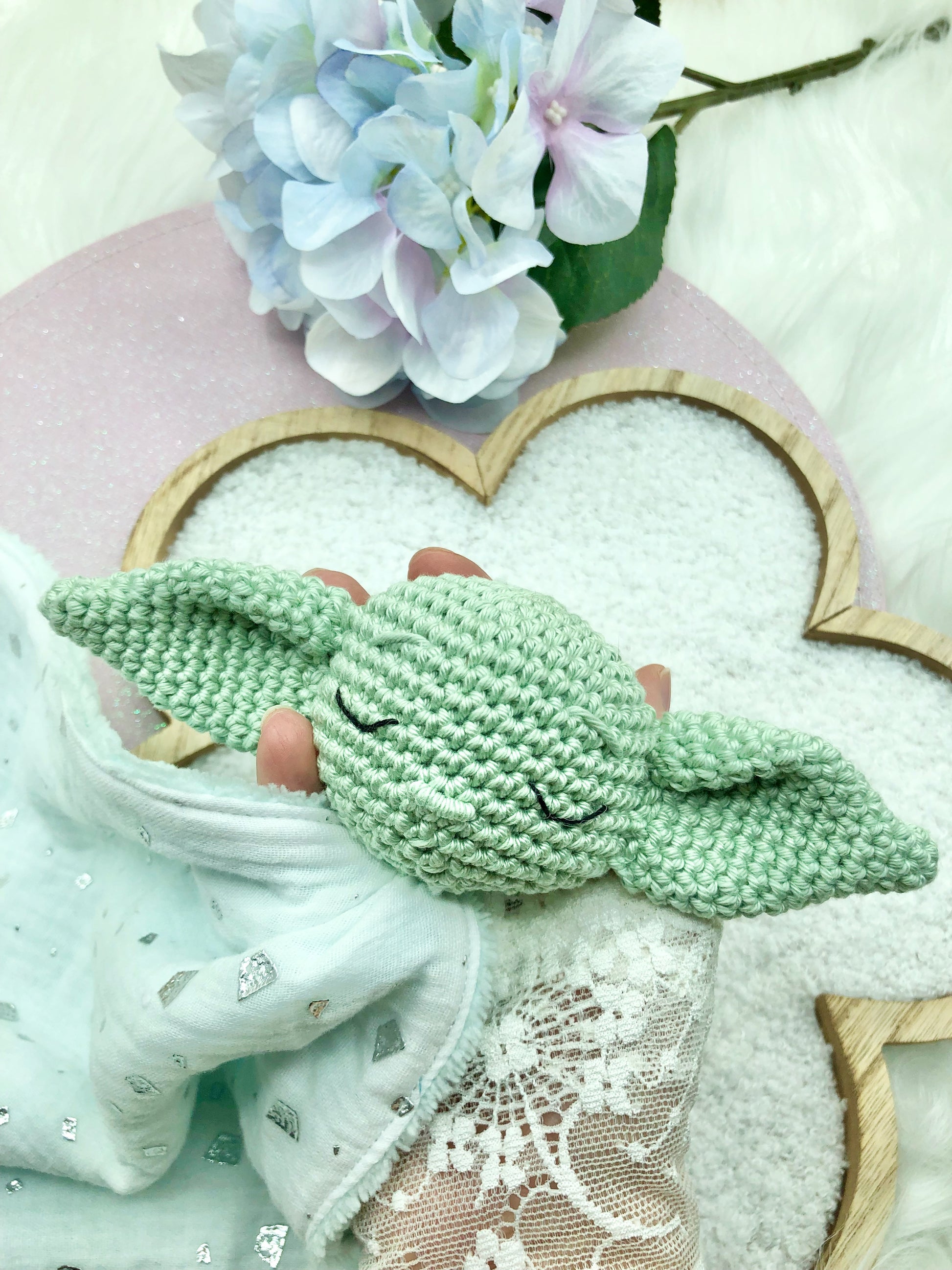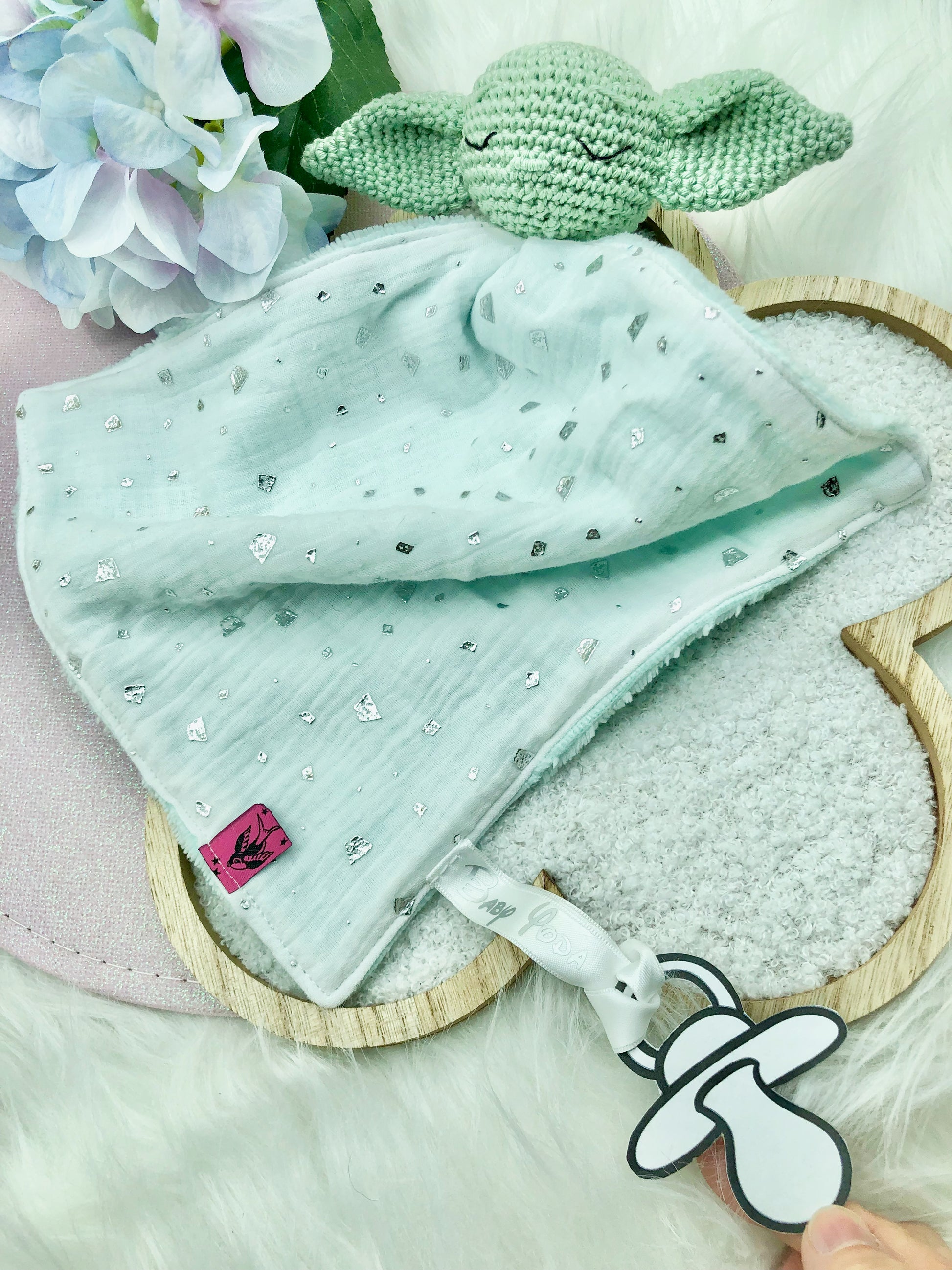 Doudou Grogu endormi. La tête est crochetée à la main, en fil coton. Rembourrage en ouate. Un côté en double gaze coton blanc avec petits détails en argentés et l'autre en éponge bambou vert menthe, toute douce.