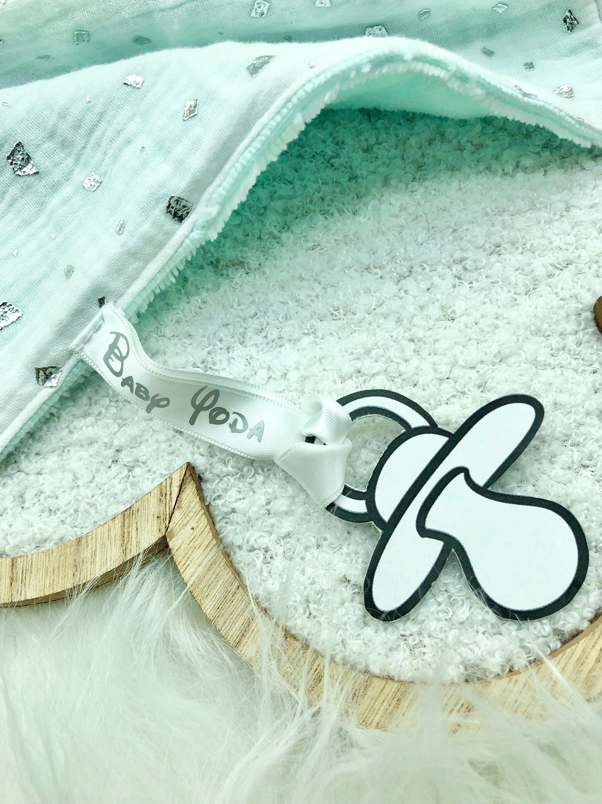 Il peut être personnalisé au prénom du p'tit bout, sur un ruban qui servira aussi d'attache-tétine. Il suffit de me l'indiquer dans la case "instructions spéciales concernant votre commande" dans votre panier. la personnalisation est offerte. Sans instructions de votre part, il sera livré sans ruban.