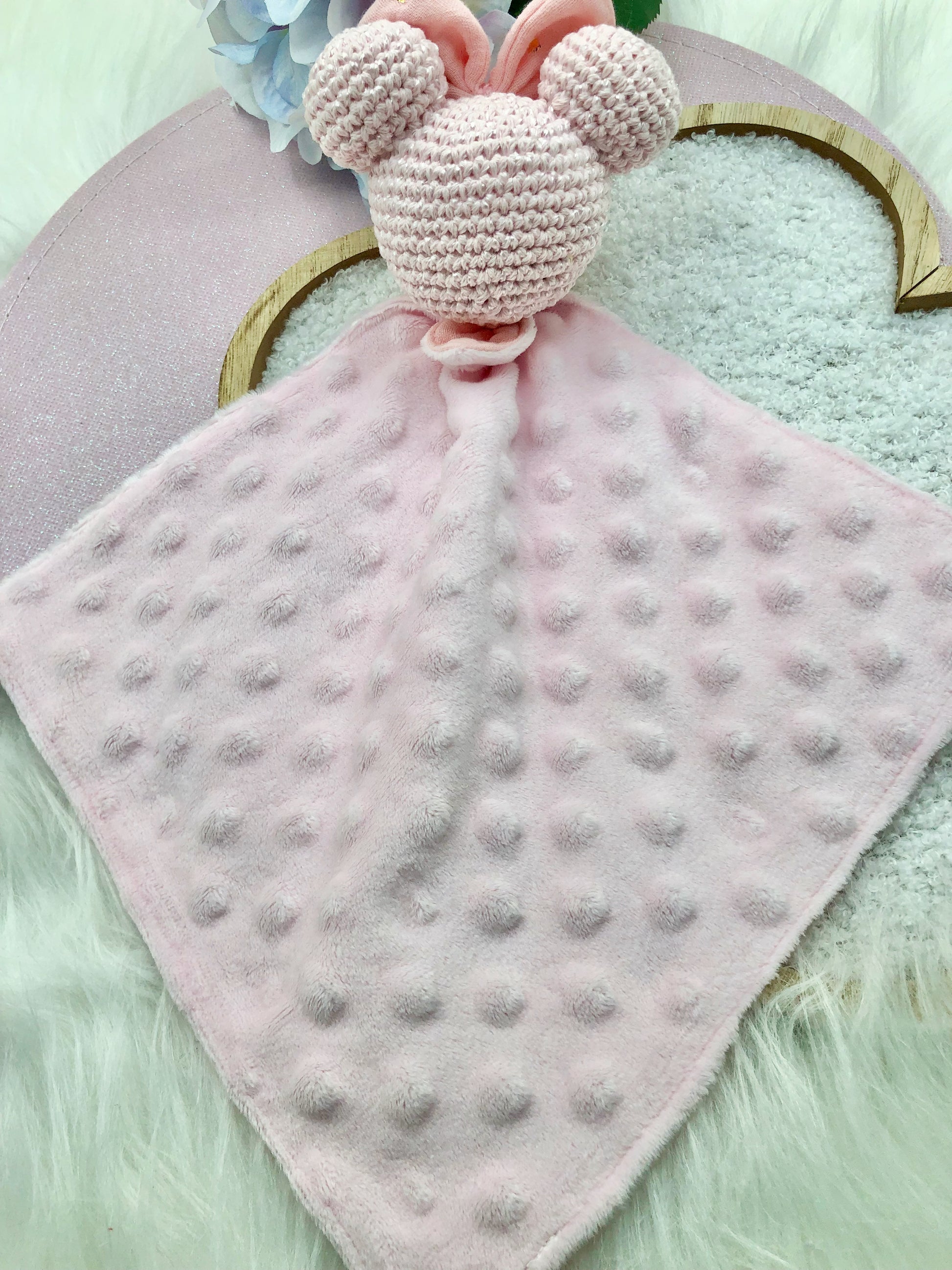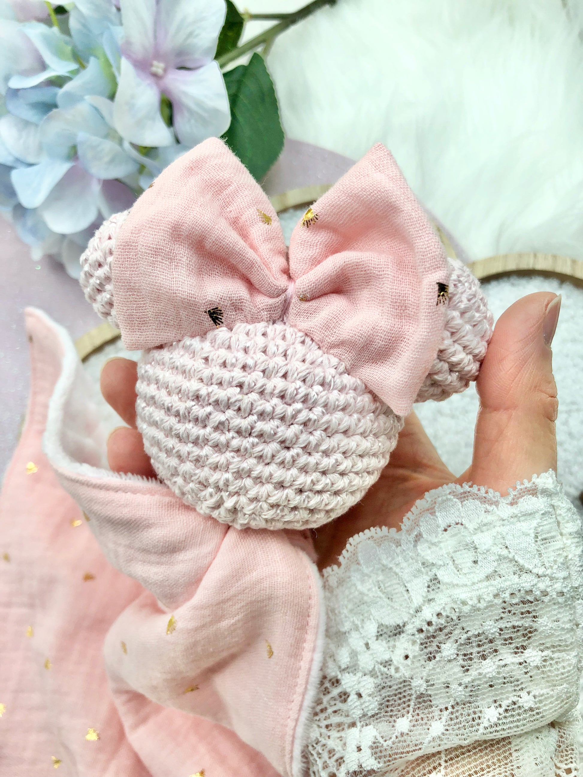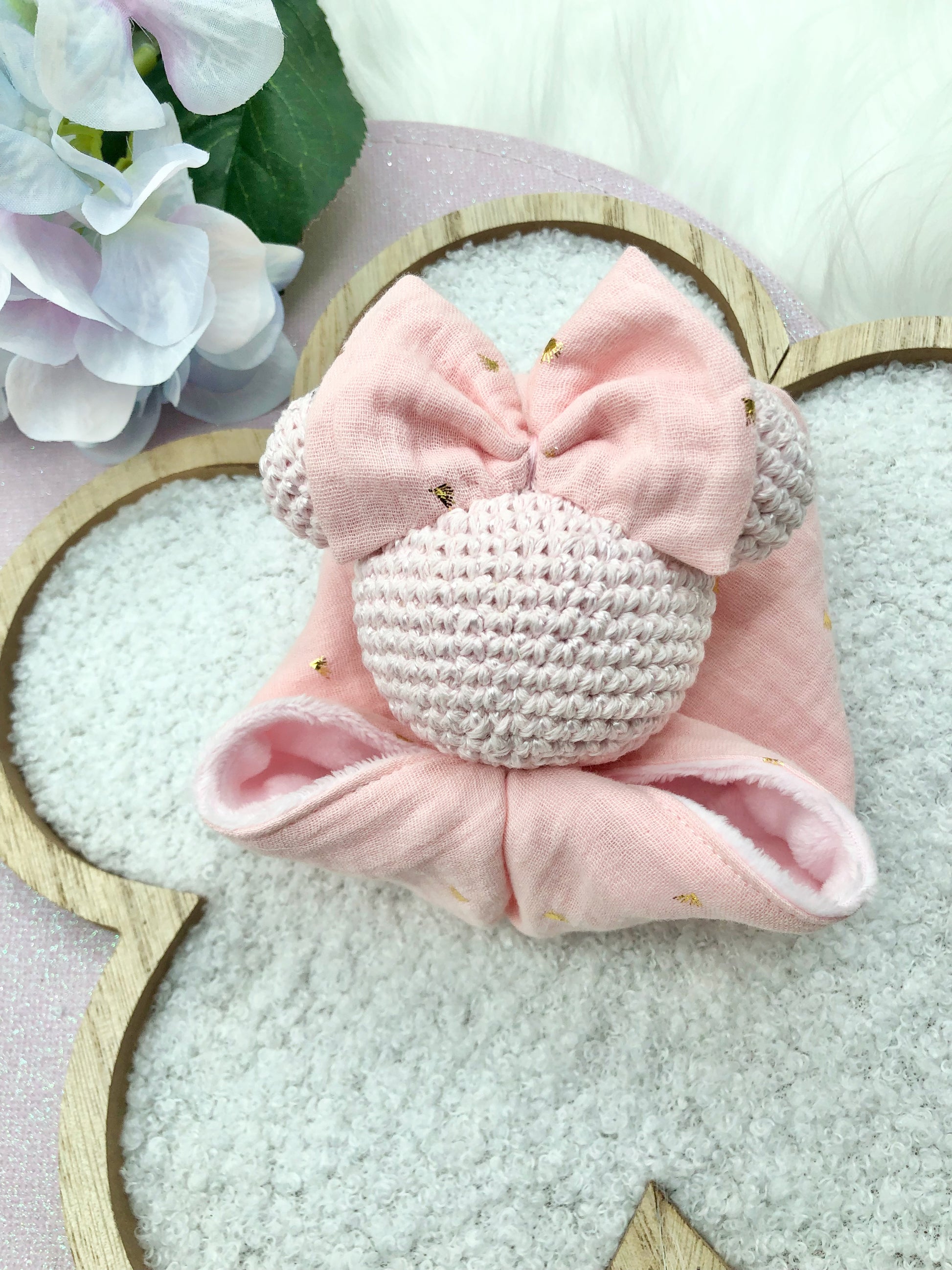 Doudou Minnie. La tête est crochetée à la main, en fil coton. Rembourrage en ouate. Un côté en double gaze coton rose avec petits détails dorés et l'autre en minky pois rose, tout doux.