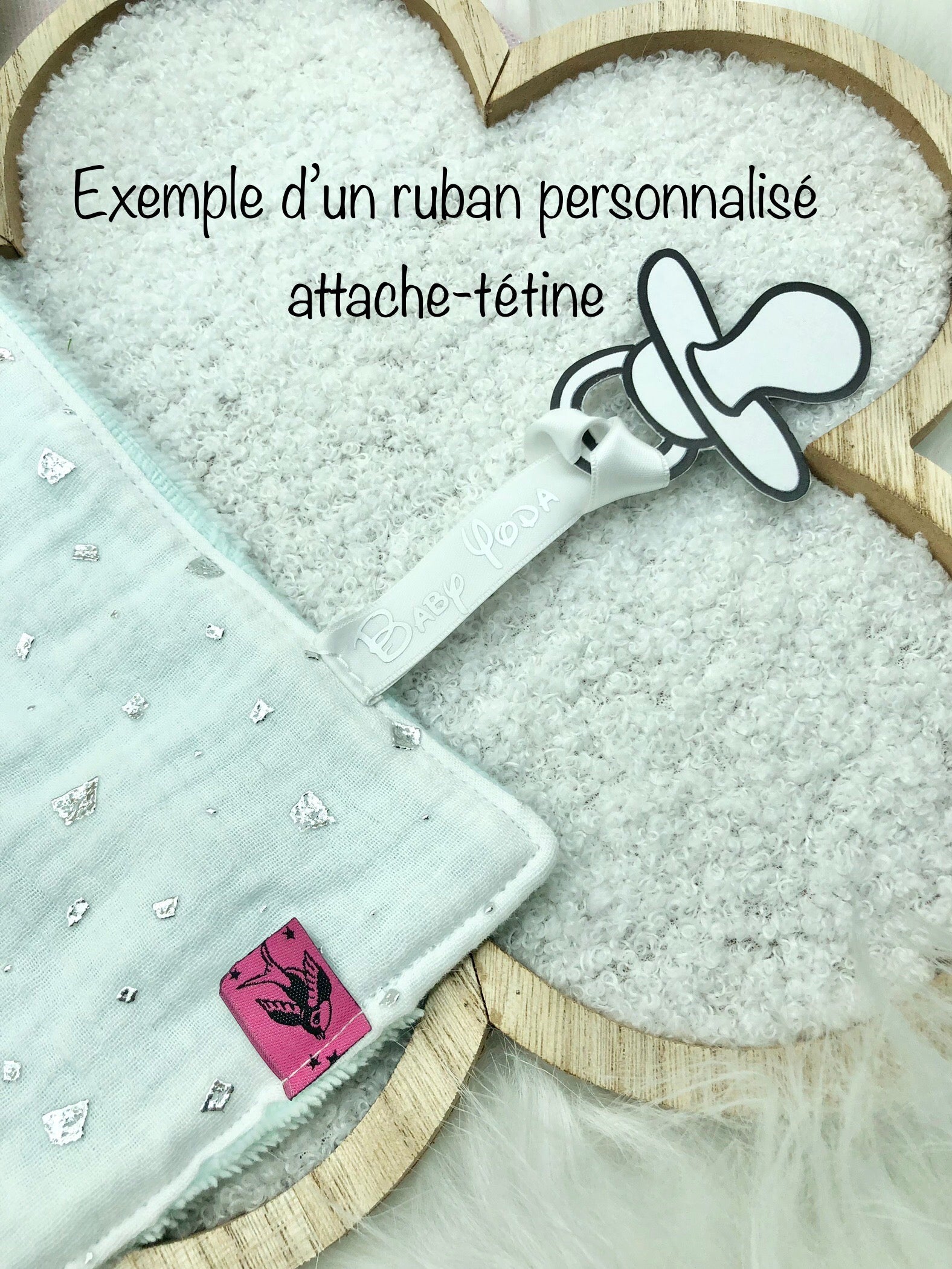 Il peut être personnalisé au prénom du p'tit bout, sur un ruban qui servira aussi d'attache-tétine. Il suffit de me l'indiquer dans la case "instructions spéciales concernant votre commande" dans votre panier. la personnalisation est offerte. Sans instructions de votre part, il sera livré sans ruban.