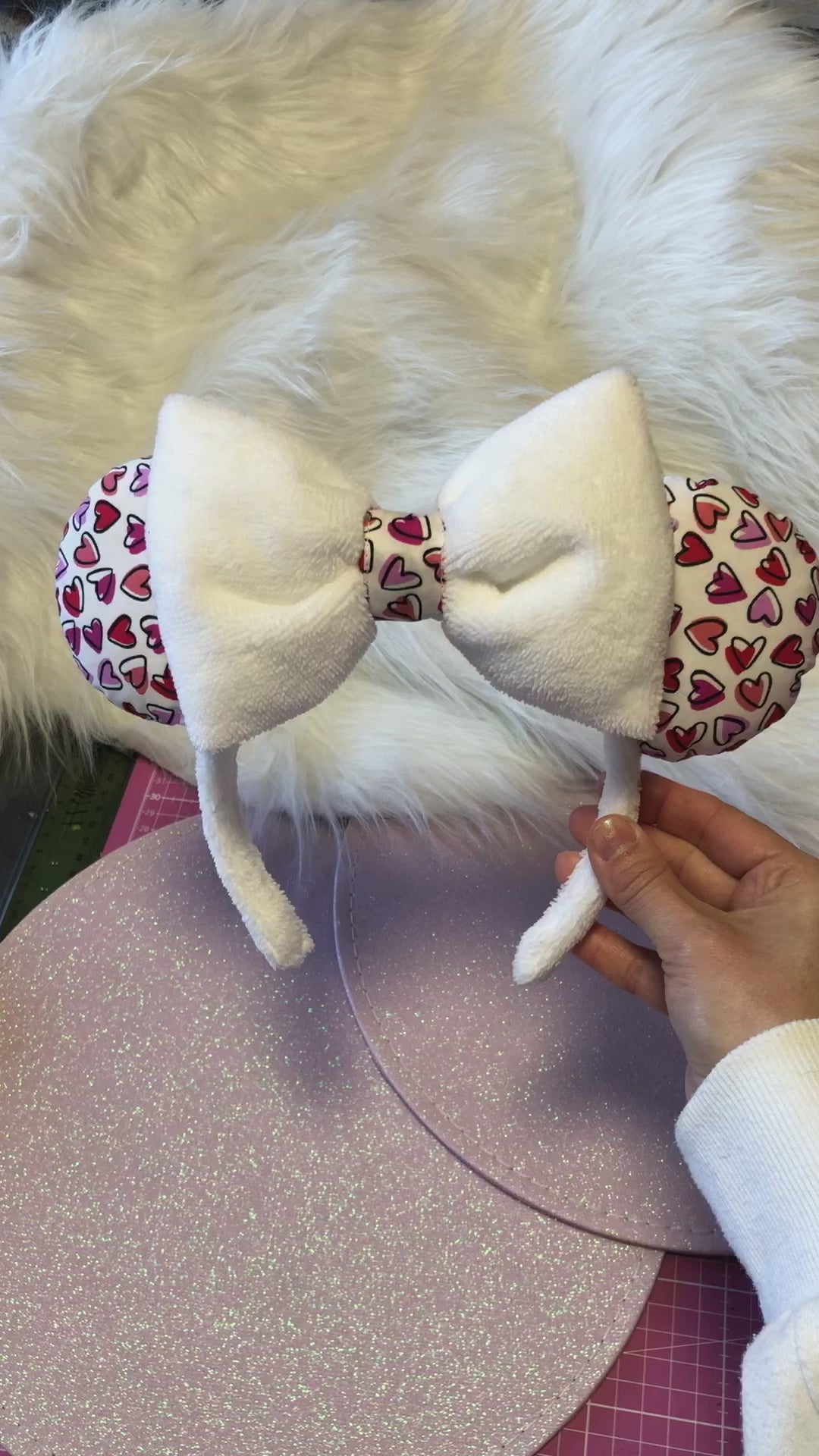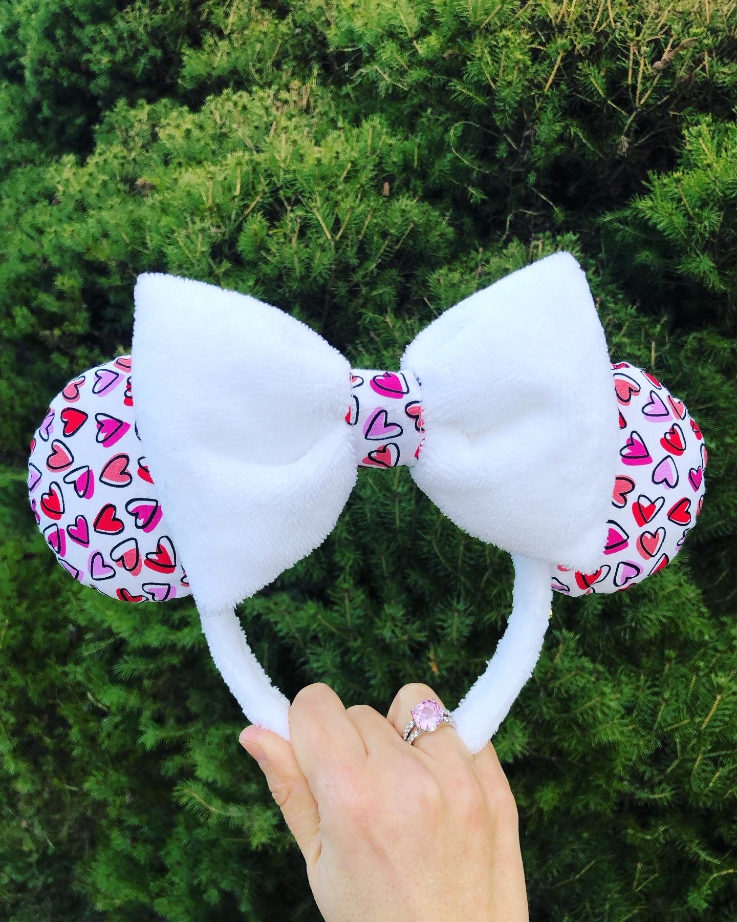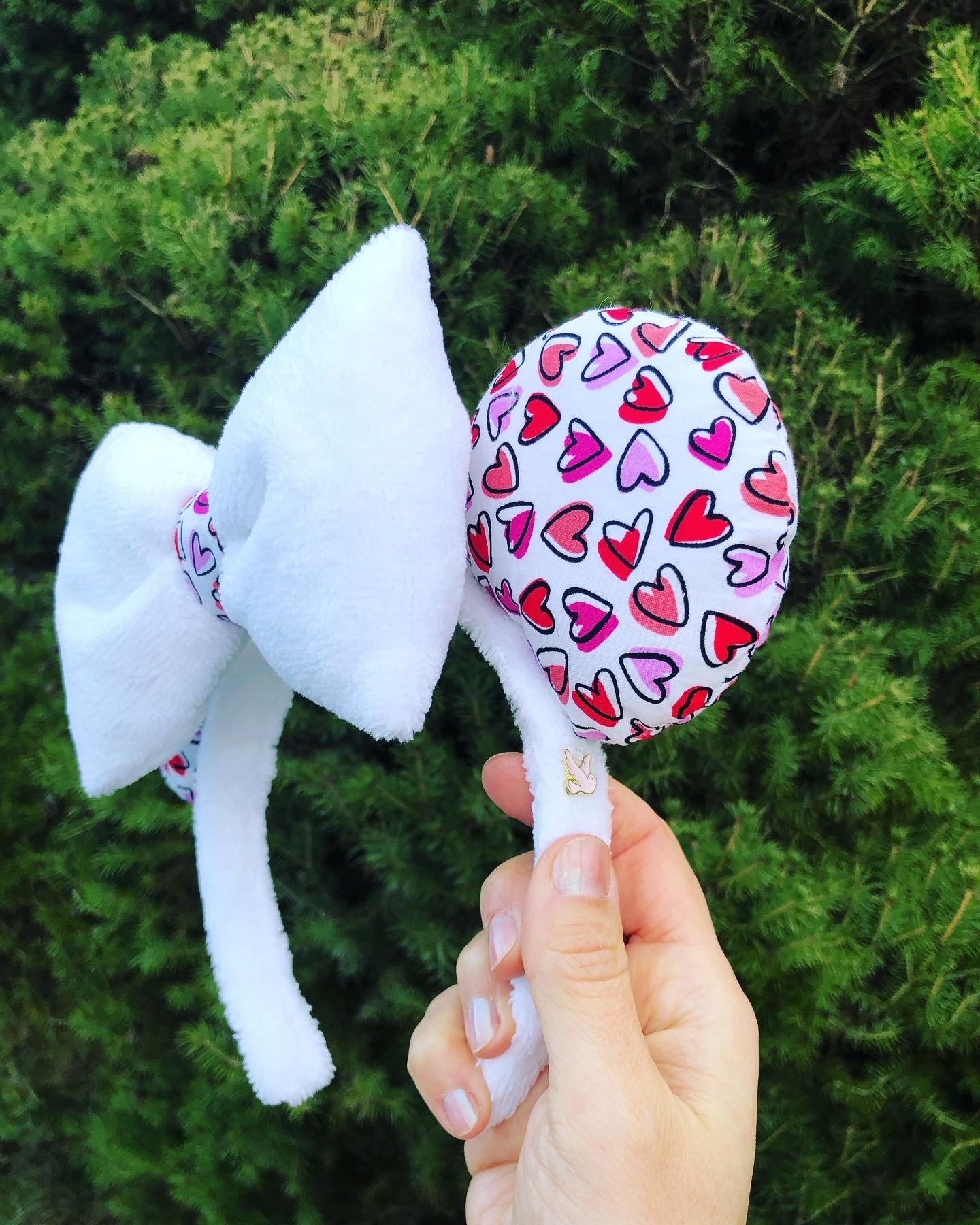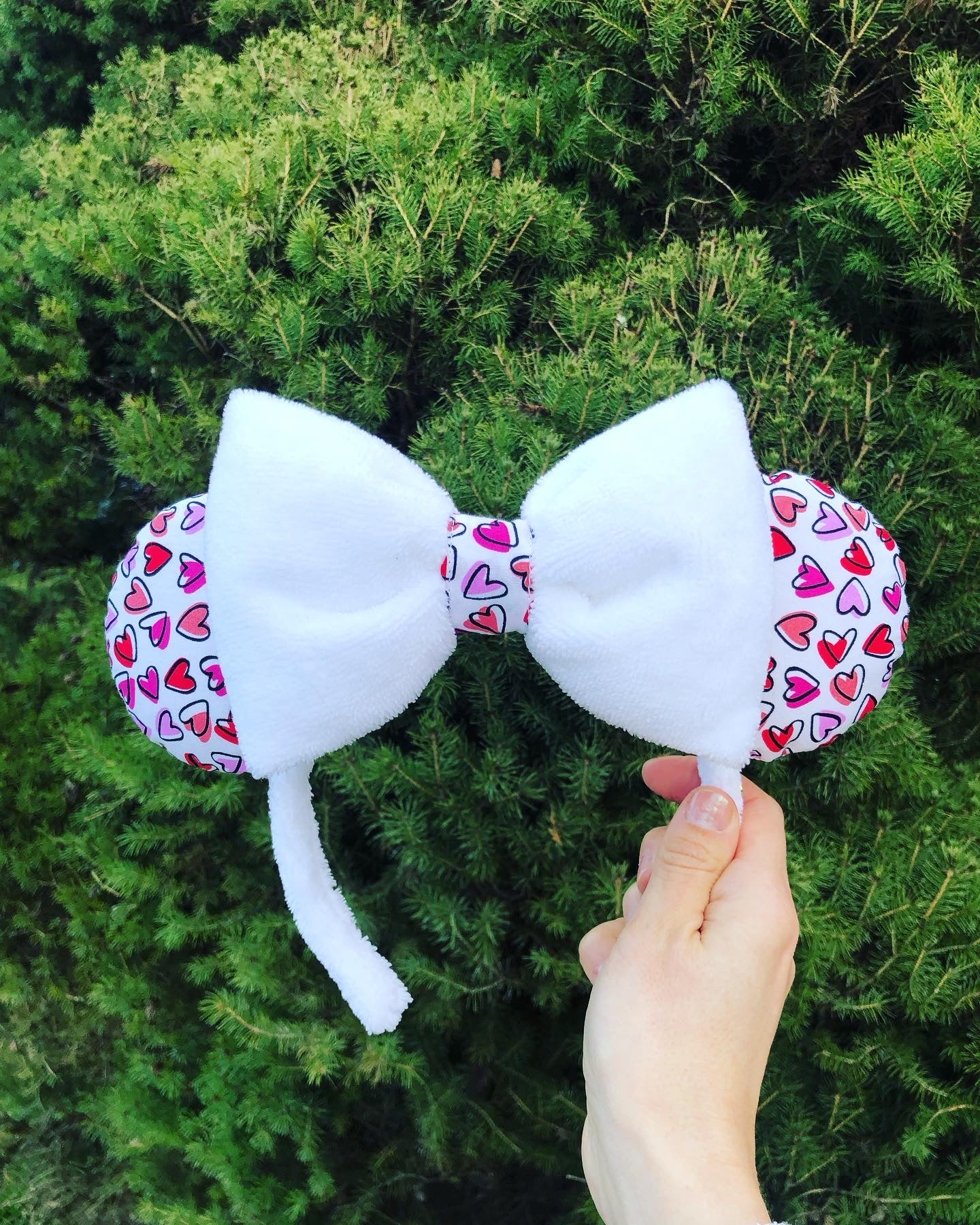 Serre-tête à oreilles de souris, en tissu coeurs. Noeud amovible (avec pince au dos) en tissu tout doux.