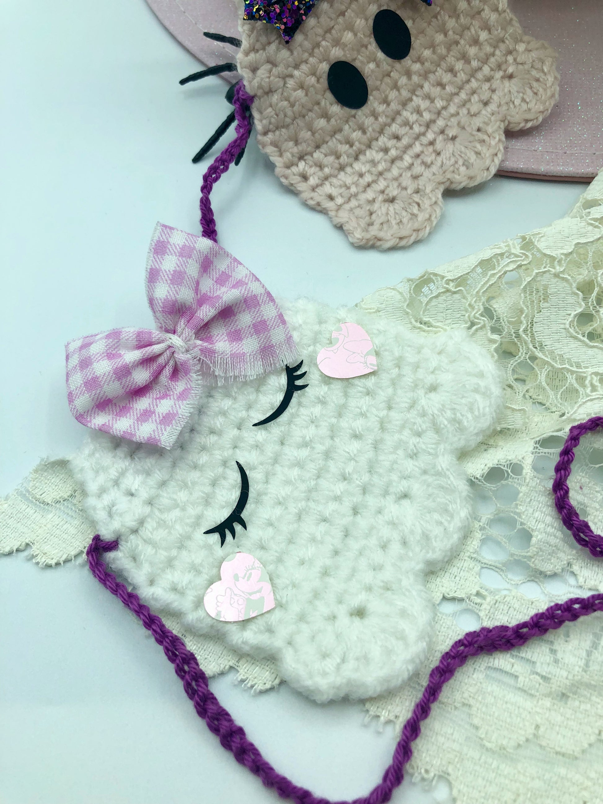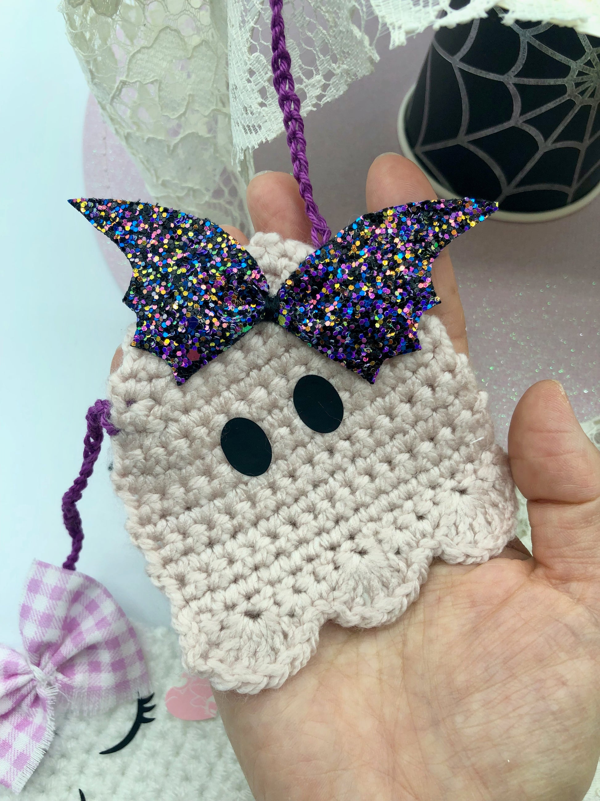 Guirlande réalisée au crochet et composée de 6 fantômes. Les 3 fantômes blancs ont des noeuds en tissu vichy rose et blanc, tandis que les 3 fantômes rose poudré, ont des noeuds en forme d'ailes de chauve-souris, en faux cuir pailleté violet. Ils sont reliés par une cordelette violette.
