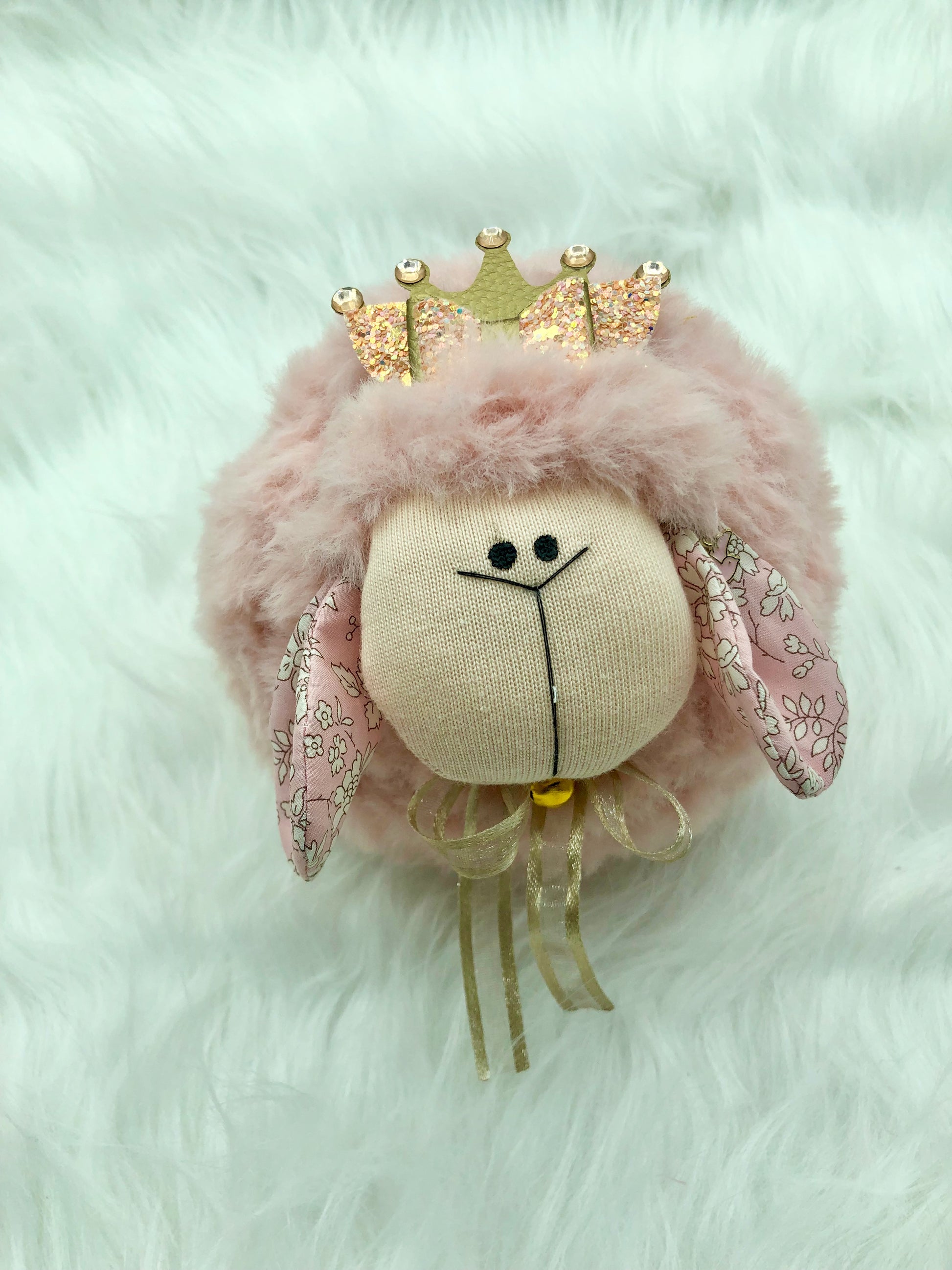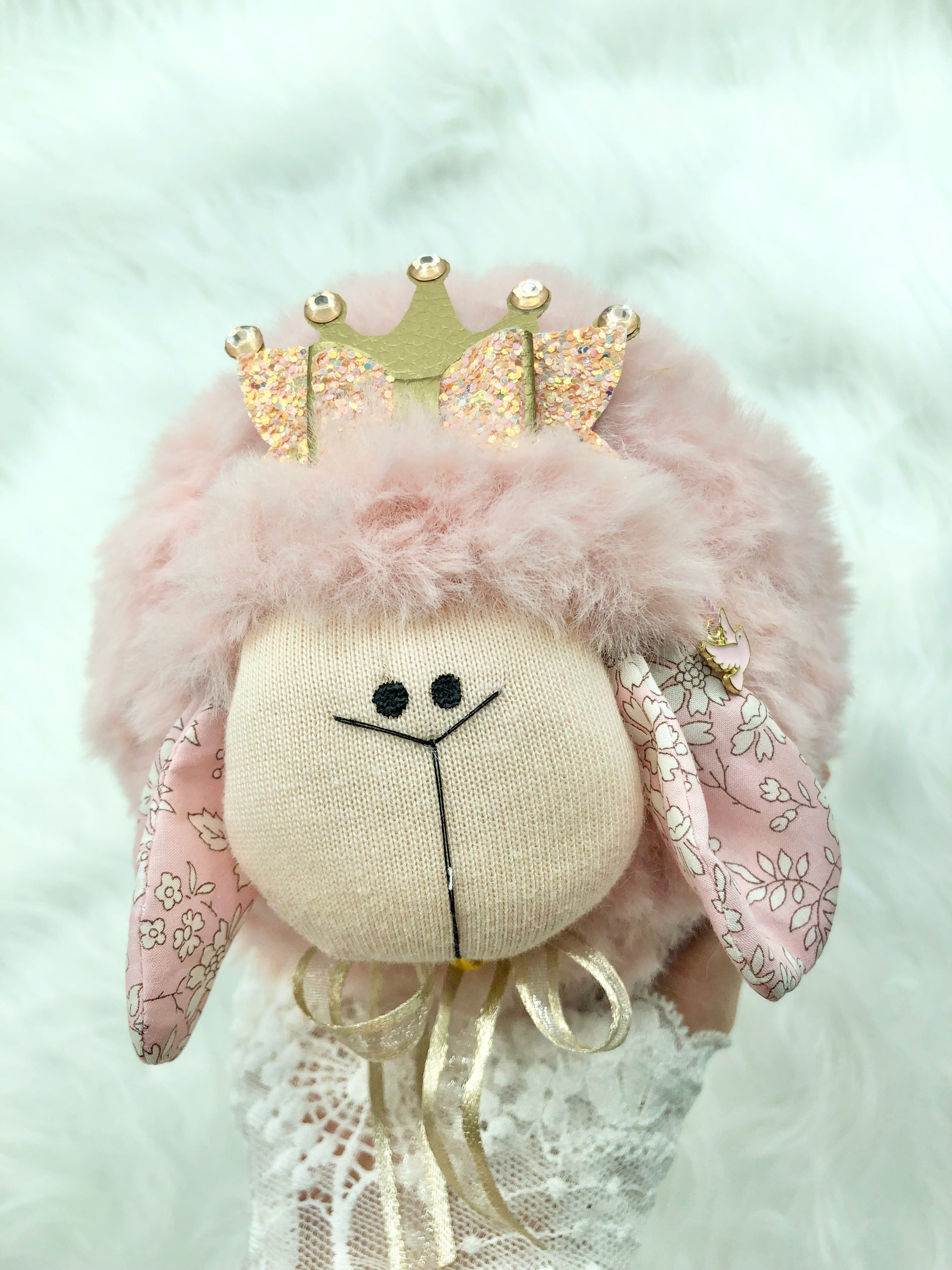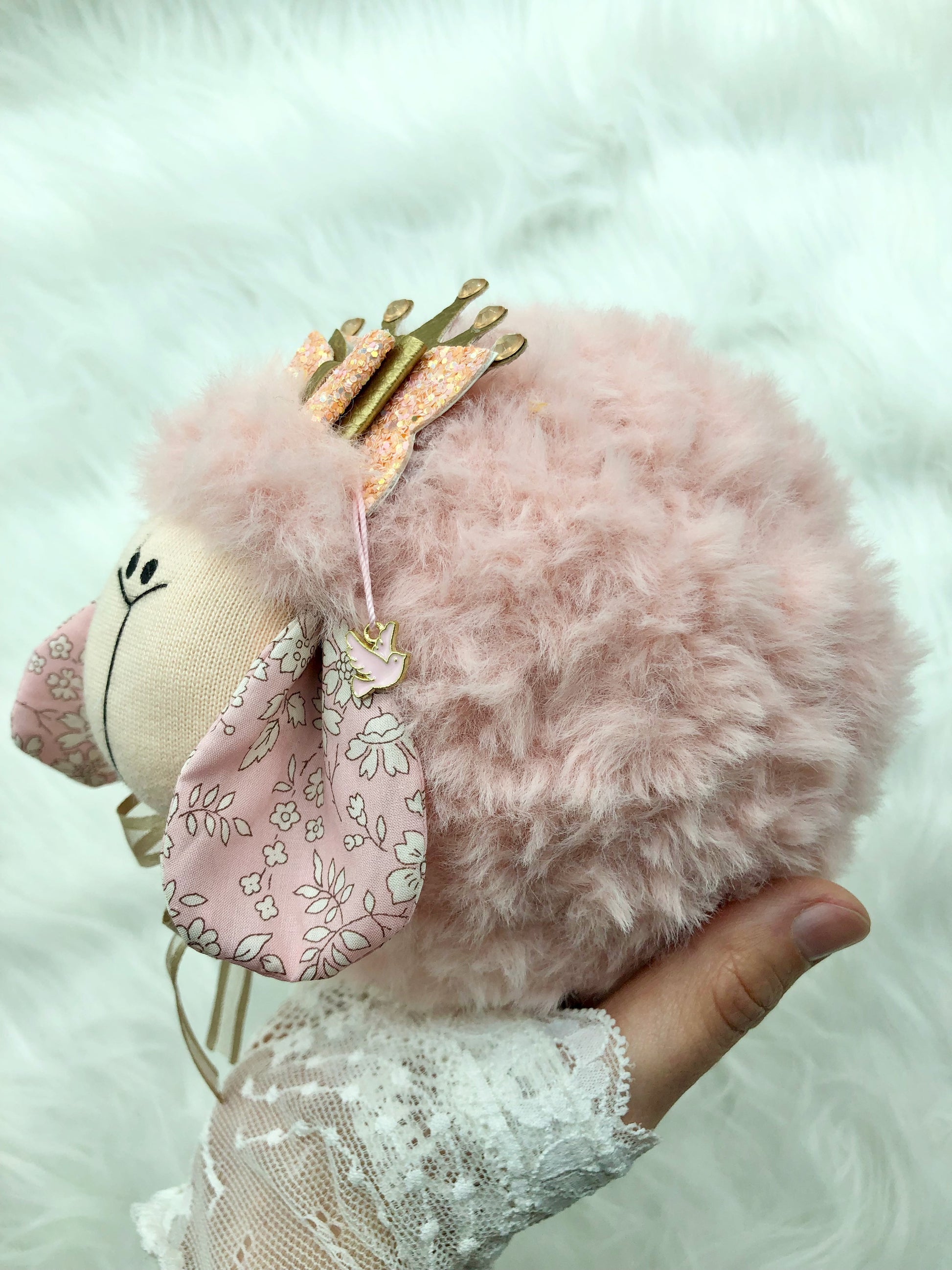 Mignon petit mouton tricoté à la main en laine fausse fourrure. rembourré en ouate Oeko-Tex. Ses oreilles sont en tissu liberty. Il a un noeud ruban avec un petit grelot et un noeud/couronne orné de strass et réalisé en faux cuir.