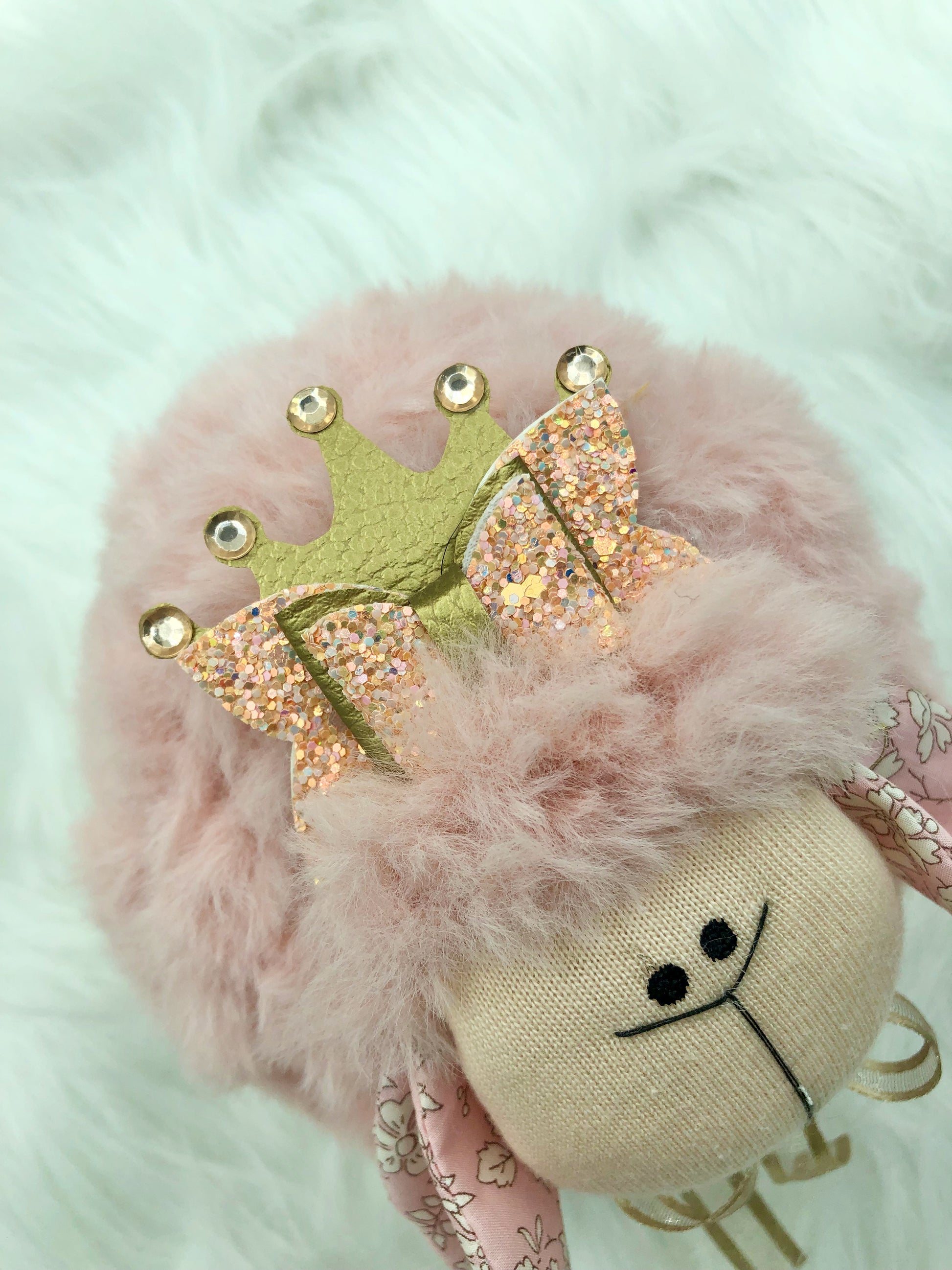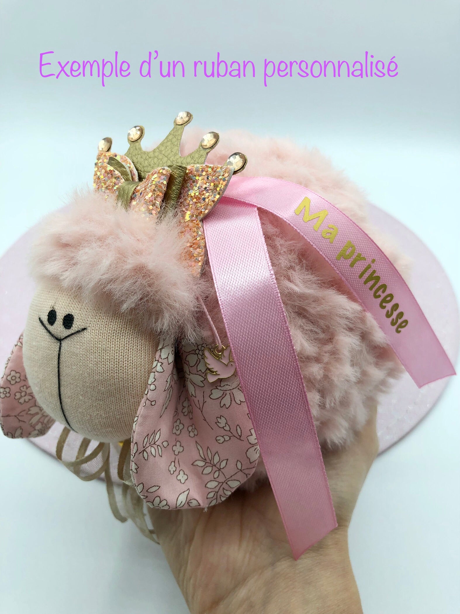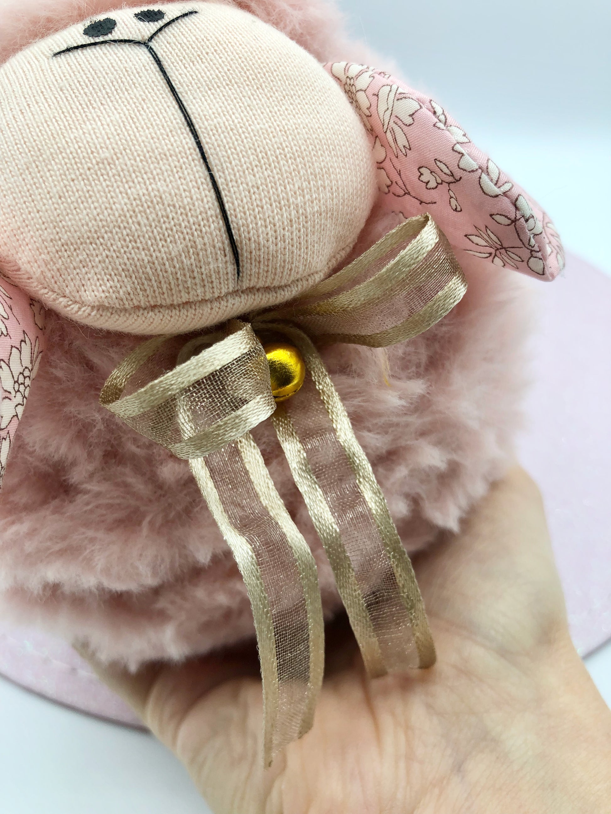 Mignon petit mouton tricoté à la main en laine fausse fourrure. rembourré en ouate Oeko-Tex. Ses oreilles sont en tissu liberty. Il a un noeud ruban avec un petit grelot et un noeud/couronne orné de strass et réalisé en faux cuir.