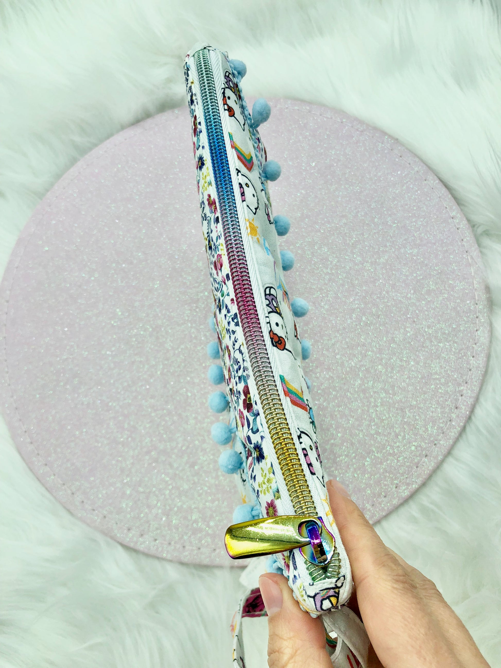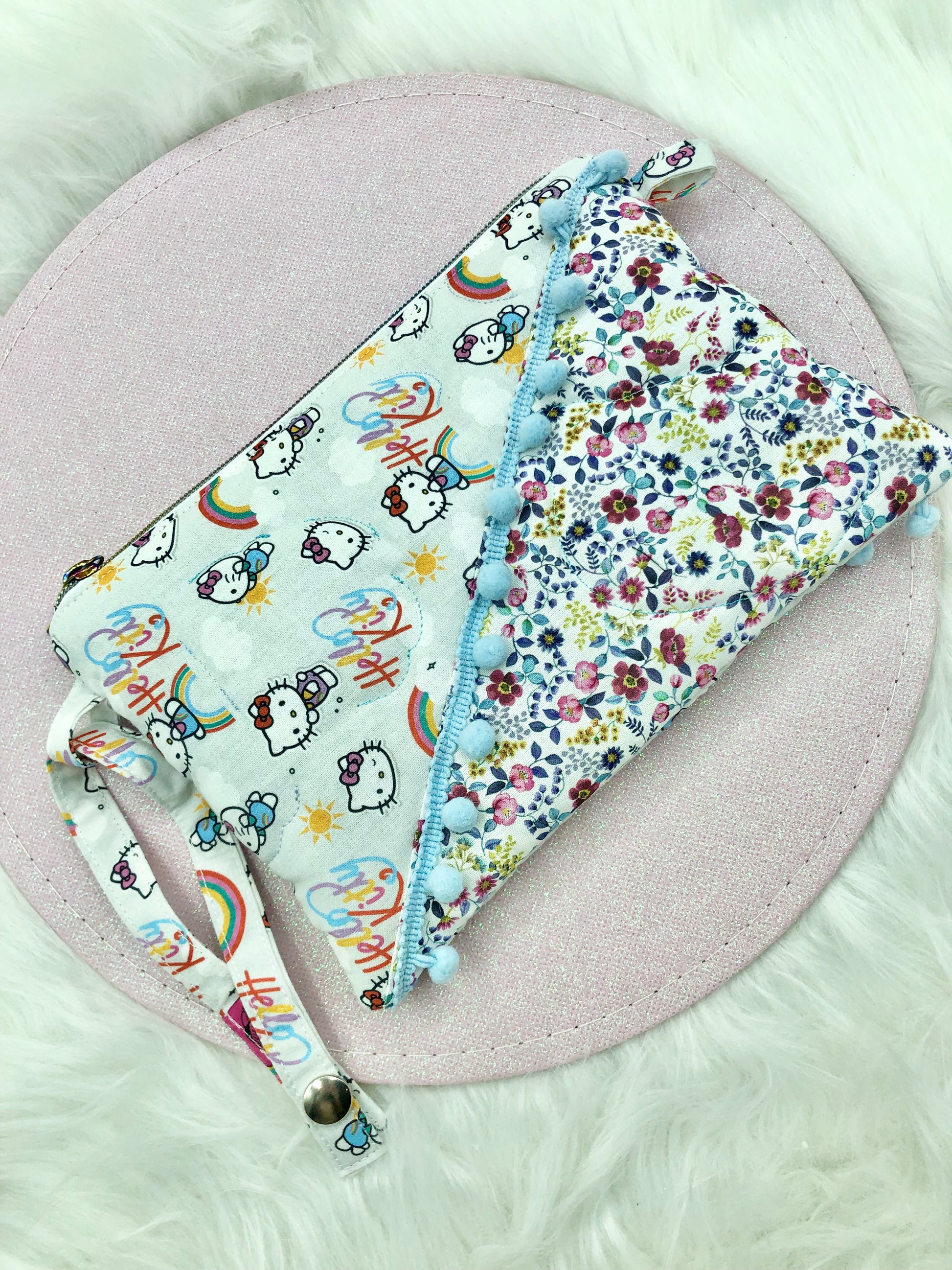 Pochette en tissu "Hello Kitty" avec sa dragonne amovible (grâce à son bouton pression). Doublée en tissu couleur menthe pailletée. Rembourrée avec une épaisseur de ouatine pour lui apporter de la tenue et pour protéger vos objets.