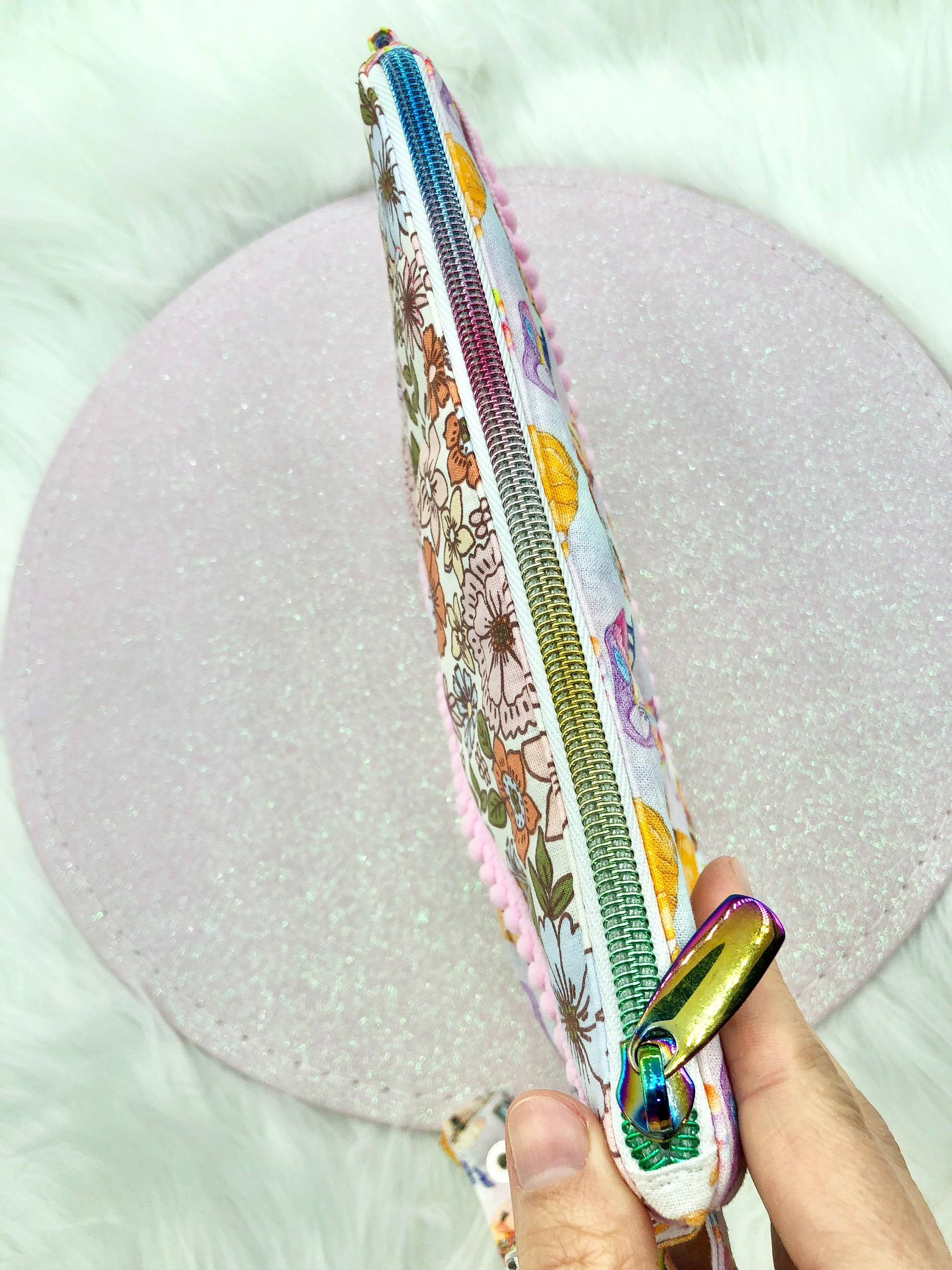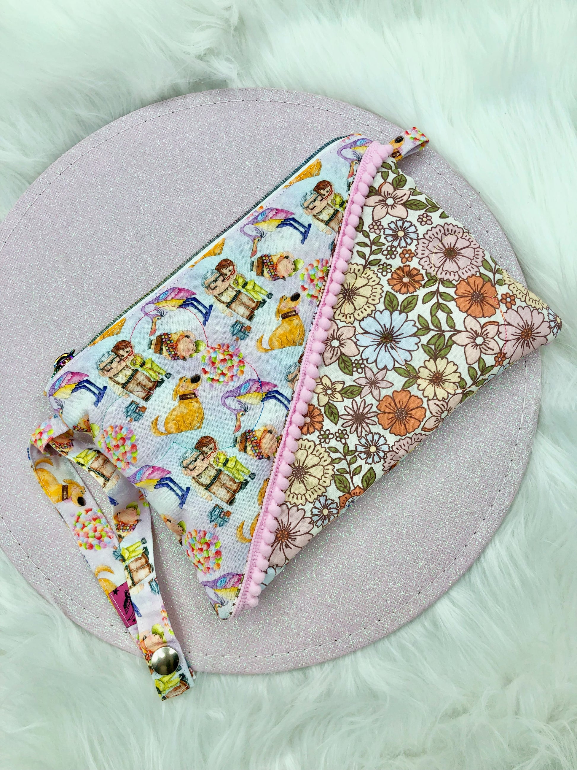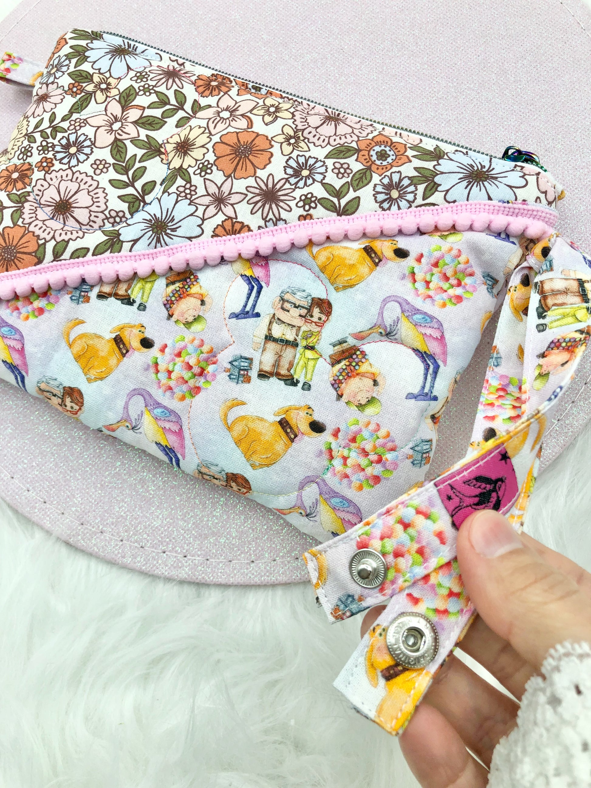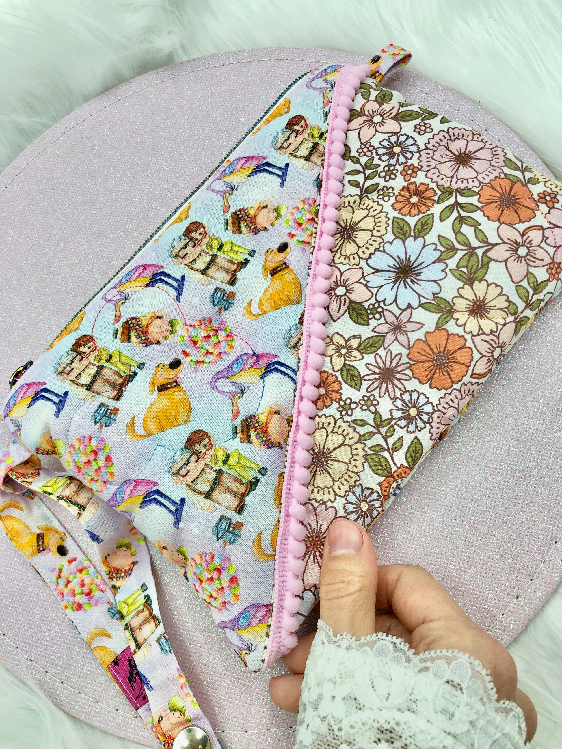 Pochette en tissu "Là haut" avec sa dragonne amovible (grâce à son bouton pression). Doublée en tissu couleur menthe pailletée. Rembourrée avec une épaisseur de ouatine pour lui apporter de la tenue et pour protéger vos objets.