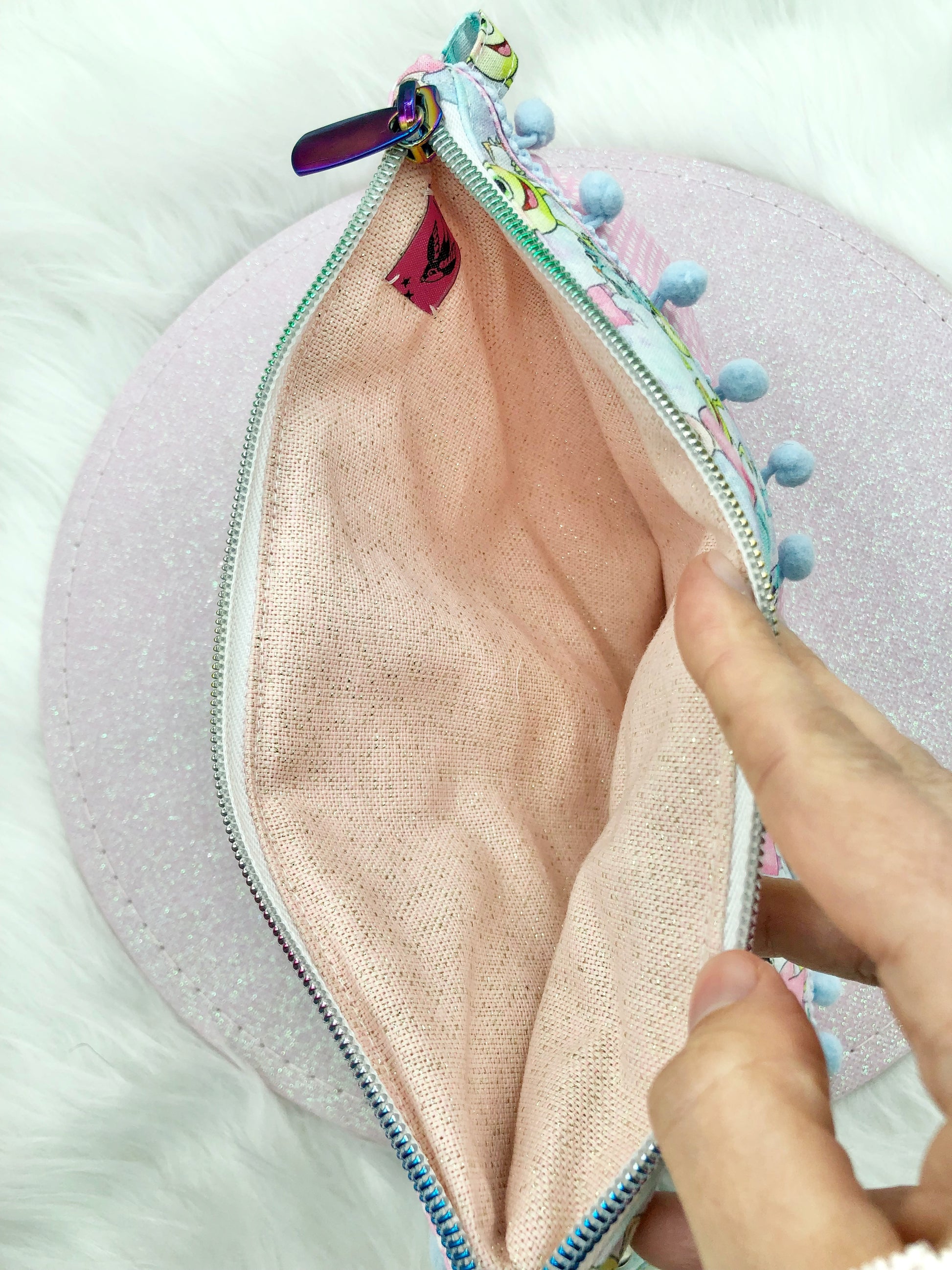 Pochette en tissu "Monstres et Cie " avec sa dragonne amovible (grâce à son bouton pression). Doublée en tissu couleur rose pailletée. Rembourrée avec une épaisseur de ouatine pour lui apporter de la tenue et pour protéger vos objets.