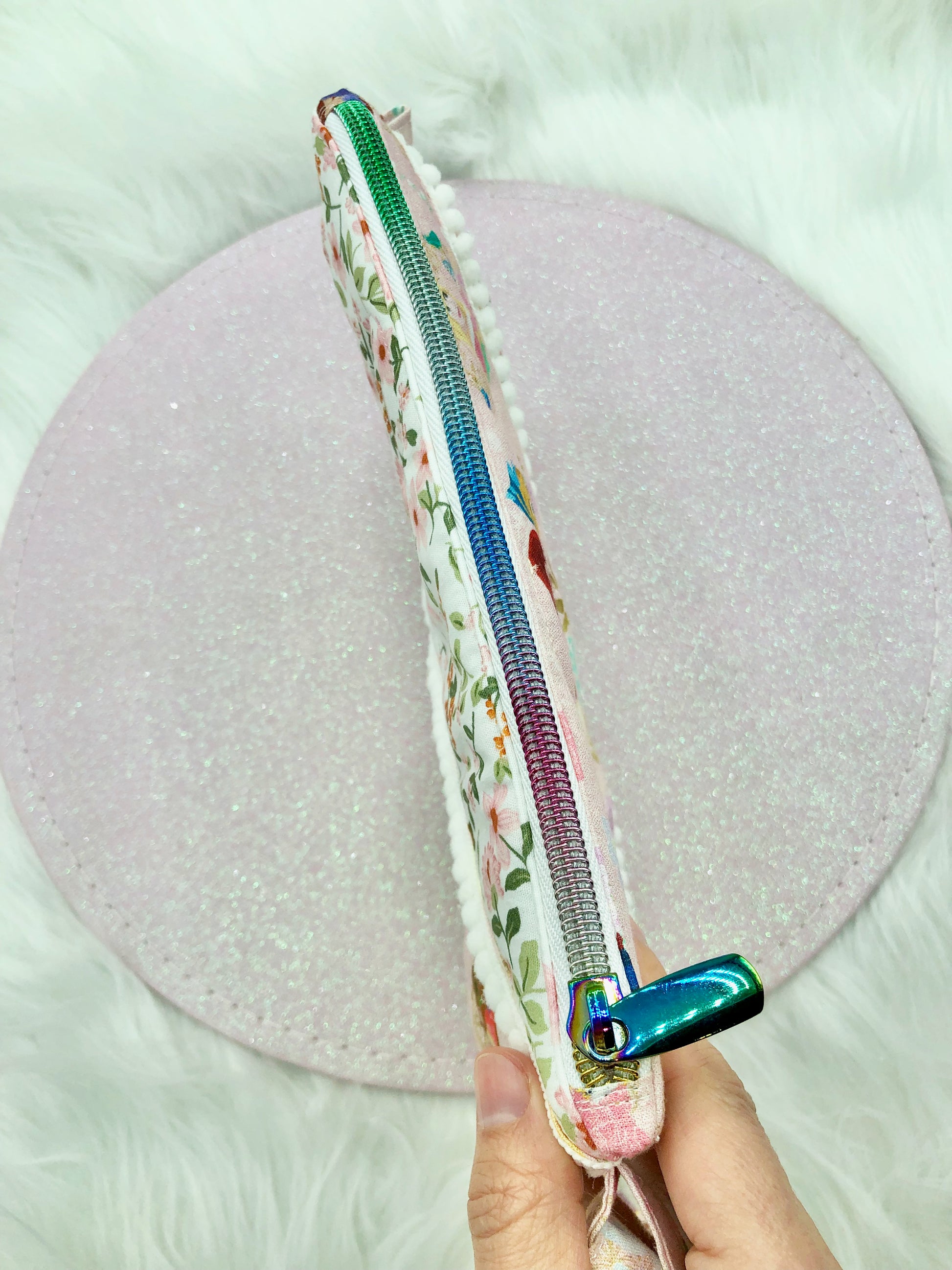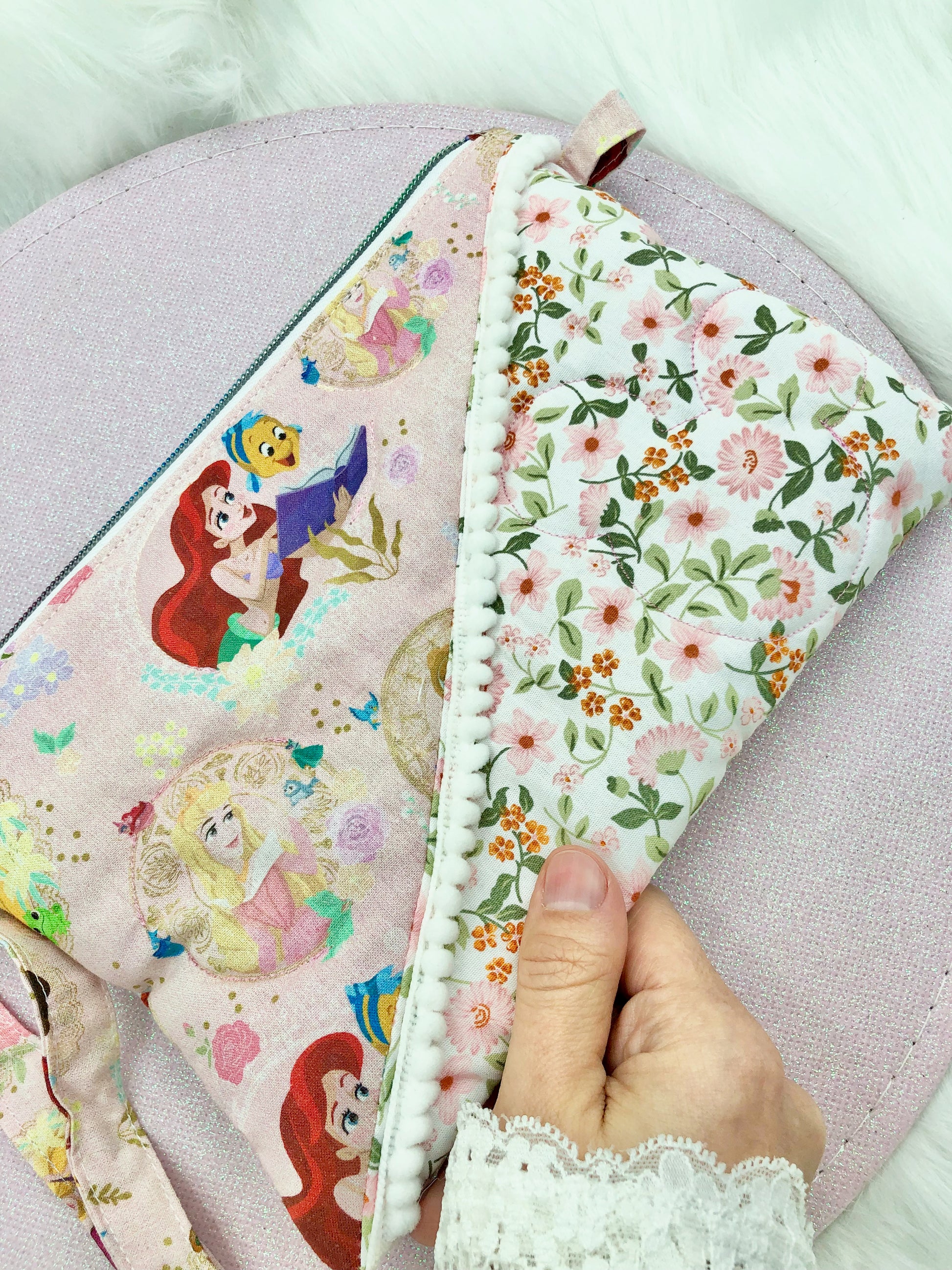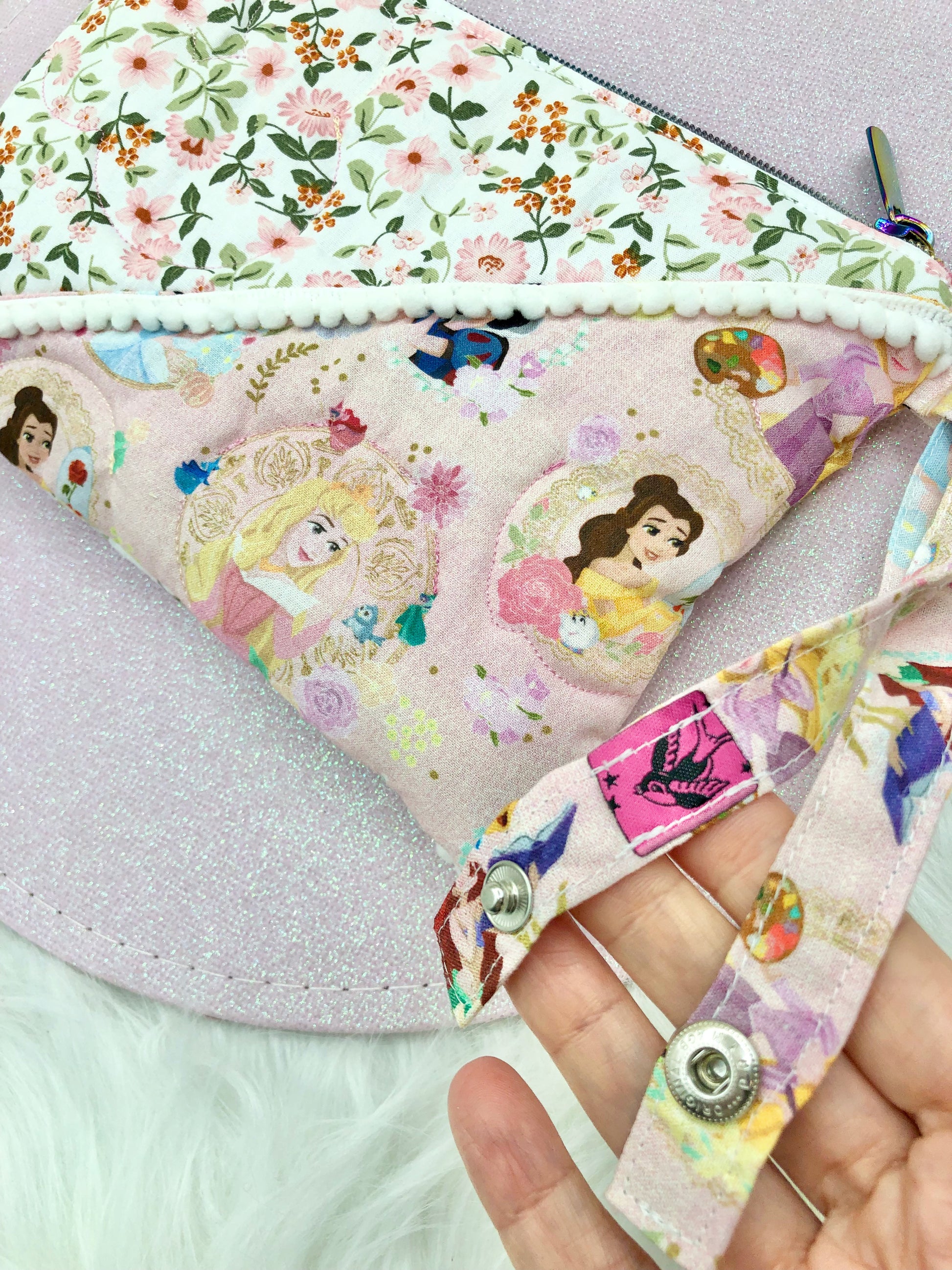 Pochette en tissu "princesses" avec sa dragonne amovible (grâce à son bouton pression). Doublée en tissu couleur rose pailleté. Rembourrée avec une épaisseur de ouatine pour lui apporter de la tenue et pour protéger vos objets.