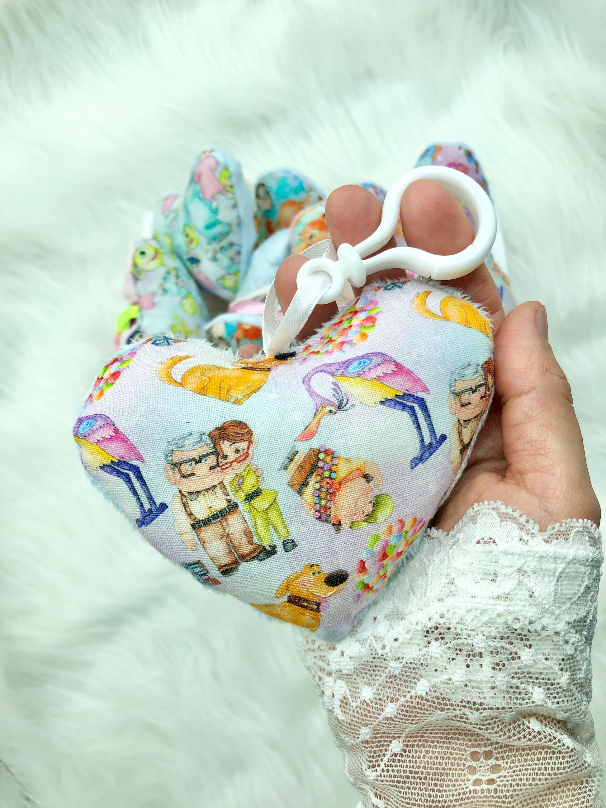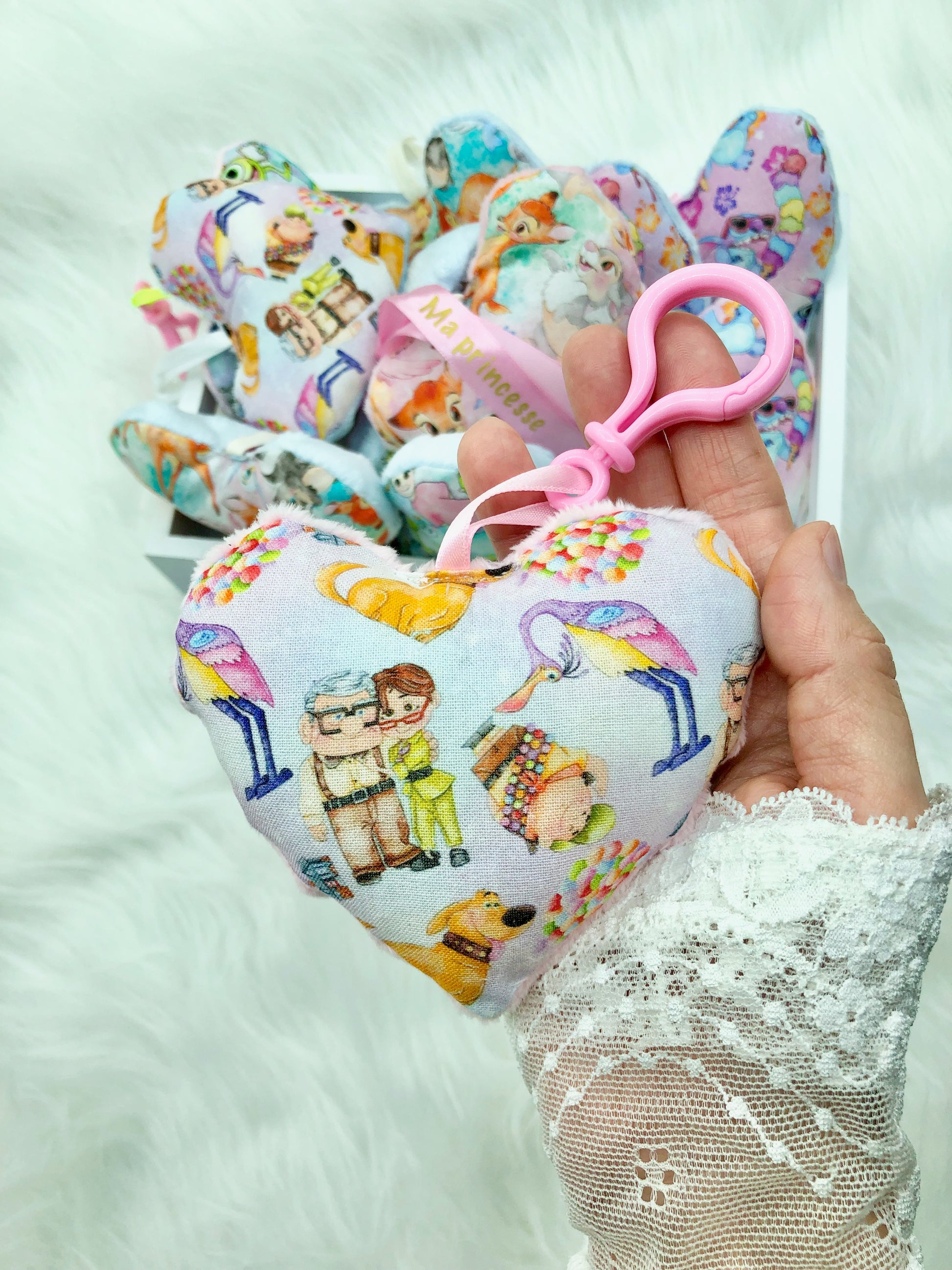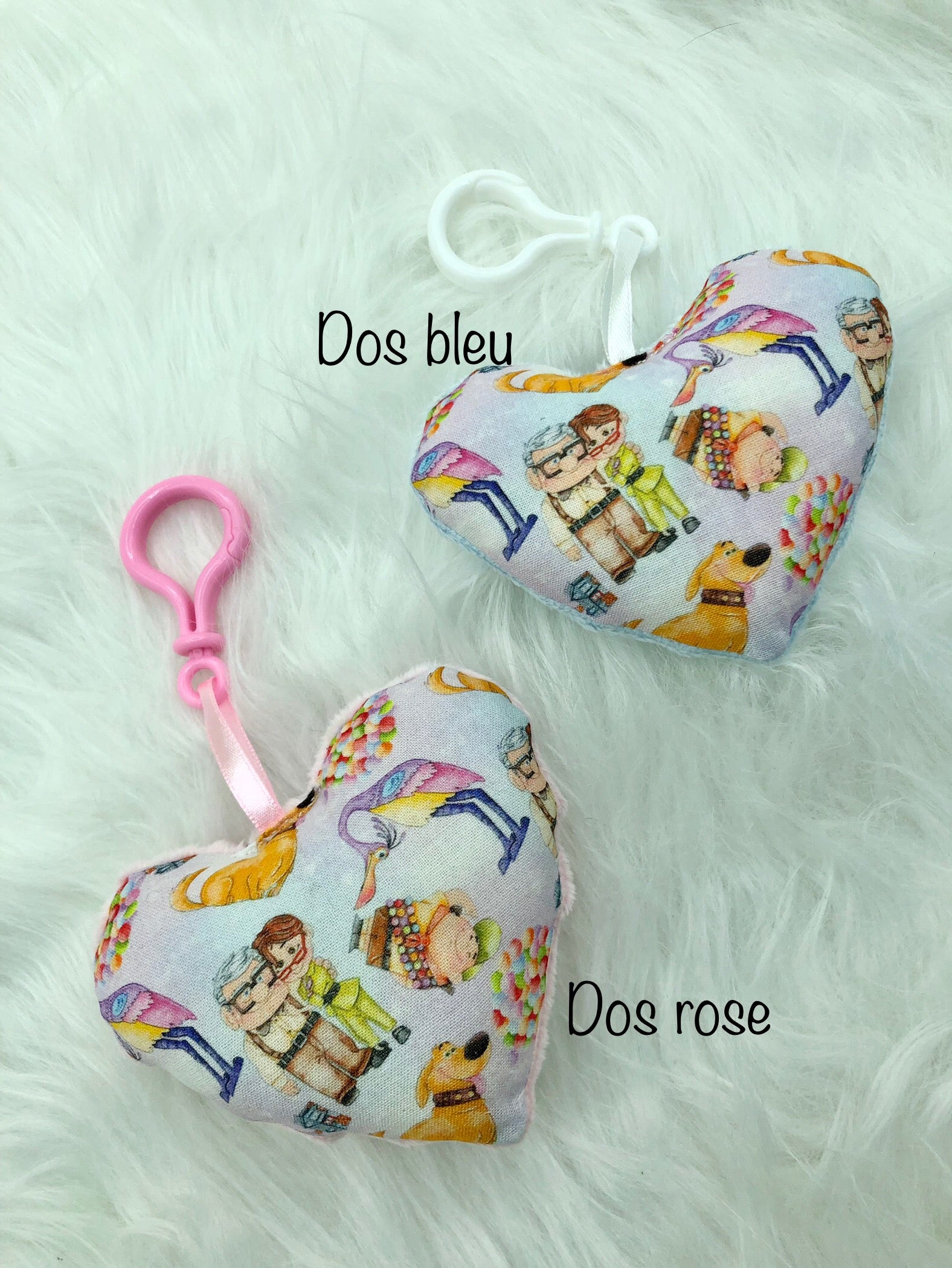 Porte-clés en forme de petit coussin coeur. Rembourré en ouate. Mousqueton en plastique. Le dos en tissu tout doux, peut être rose ou bleu.