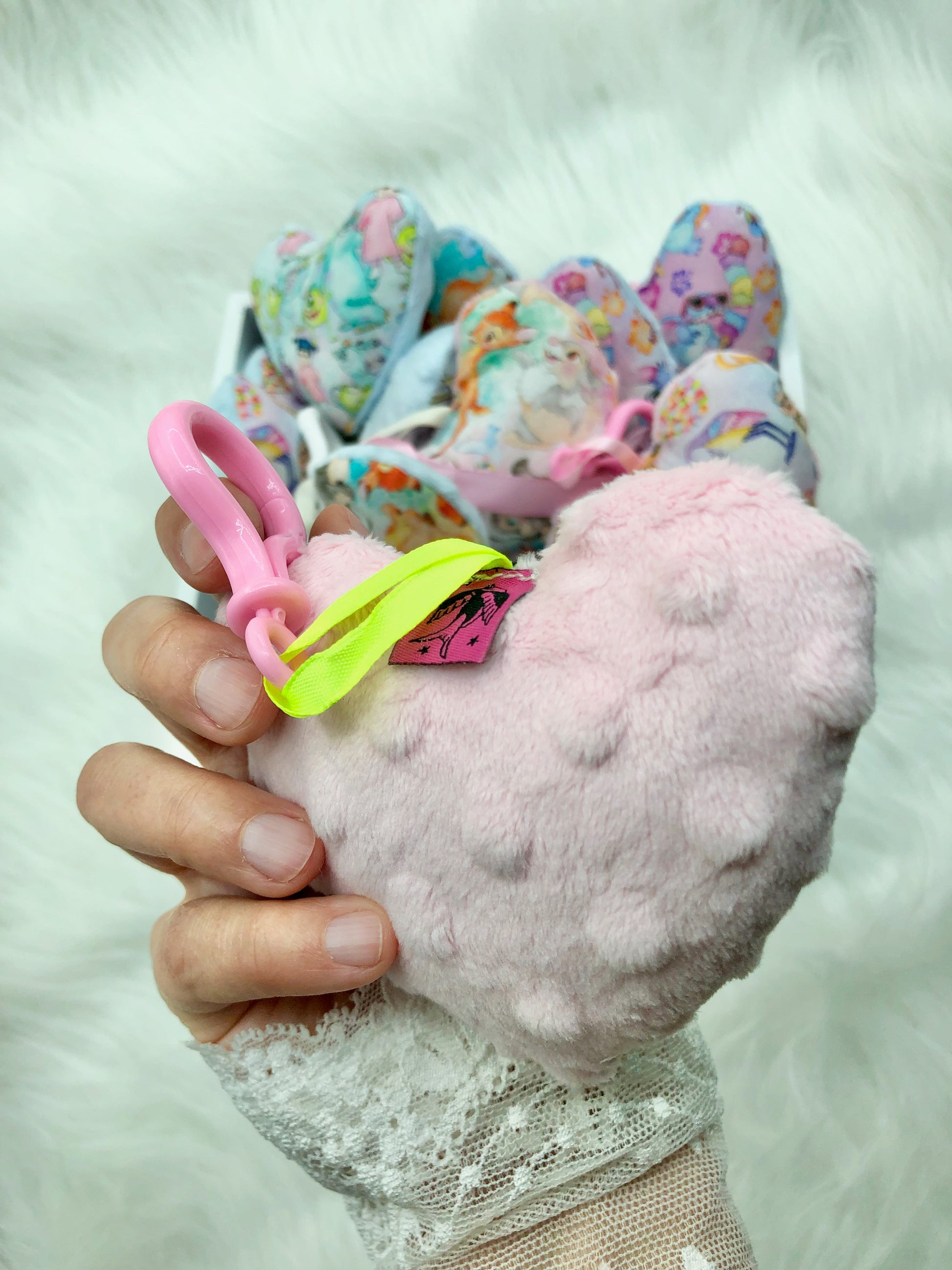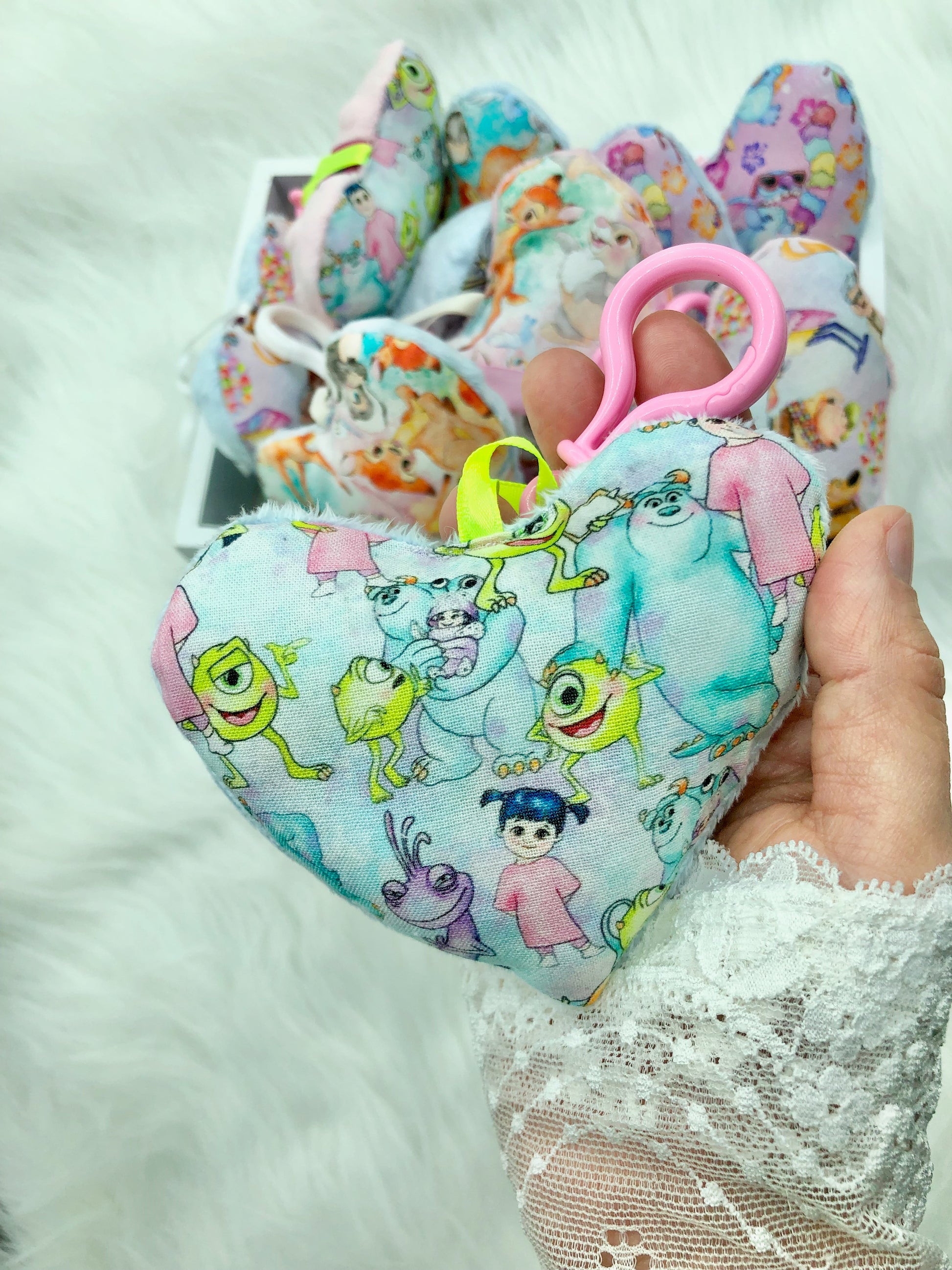 Porte-clés en forme de petit coussin coeur. Rembourré en ouate. Mousqueton en plastique. Le dos en tissu tout doux, peut être rose ou bleu.