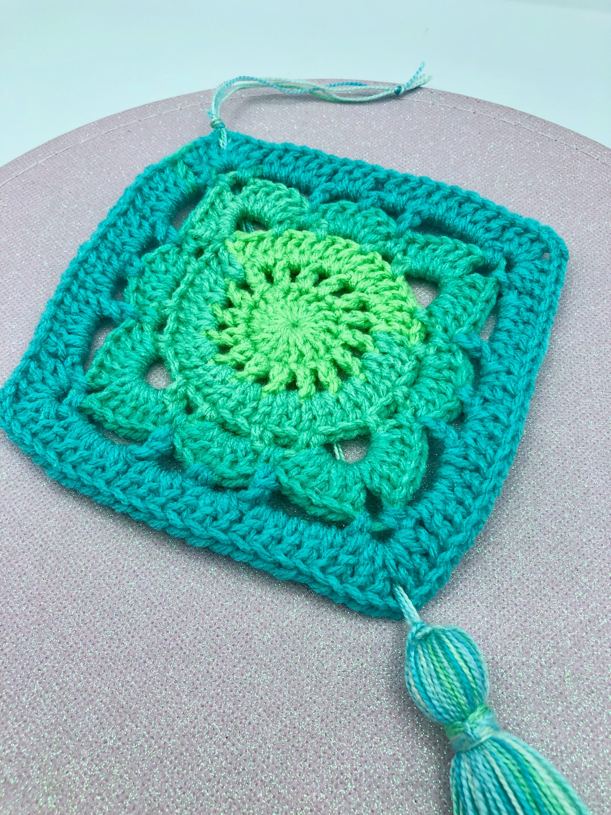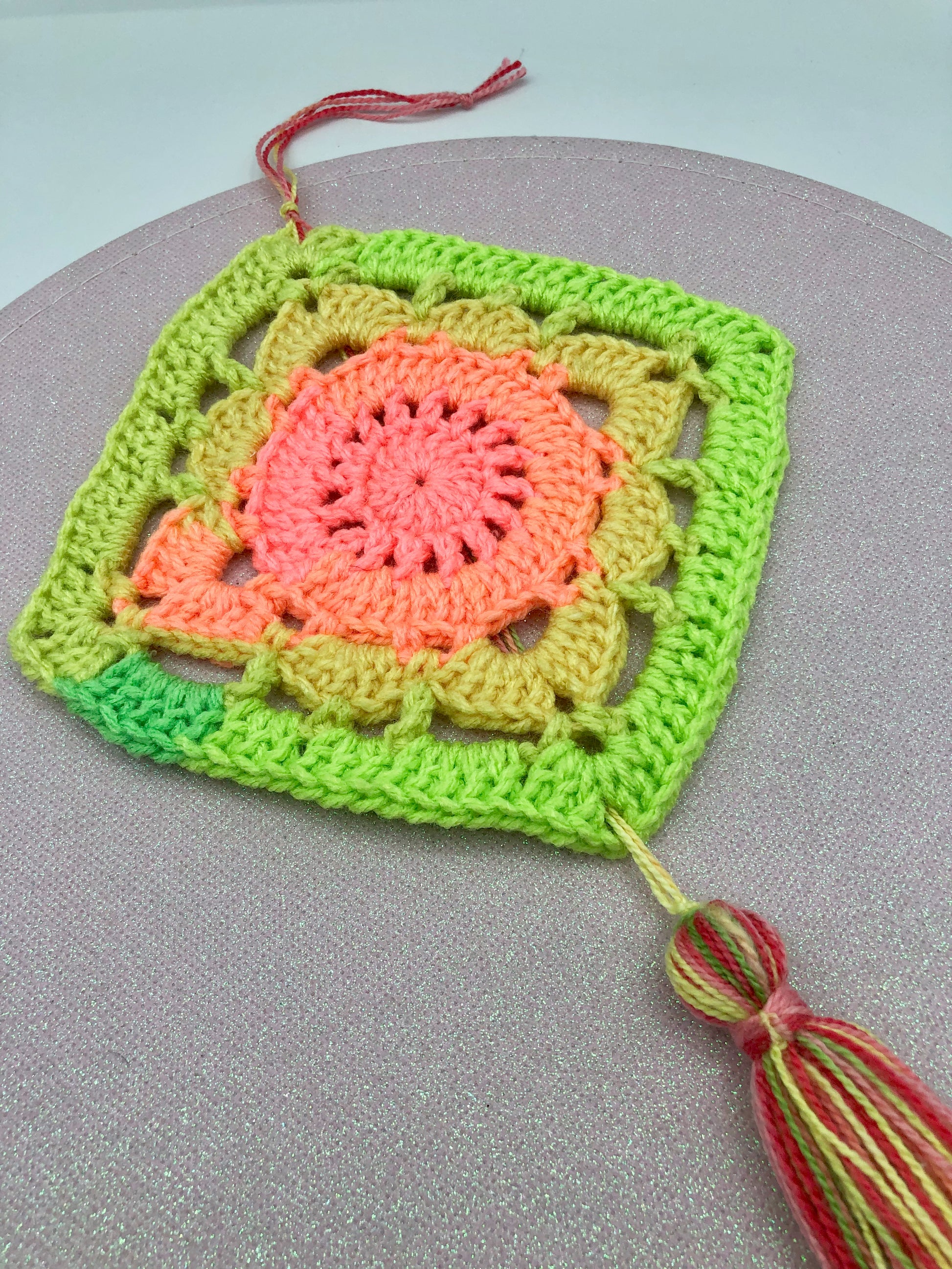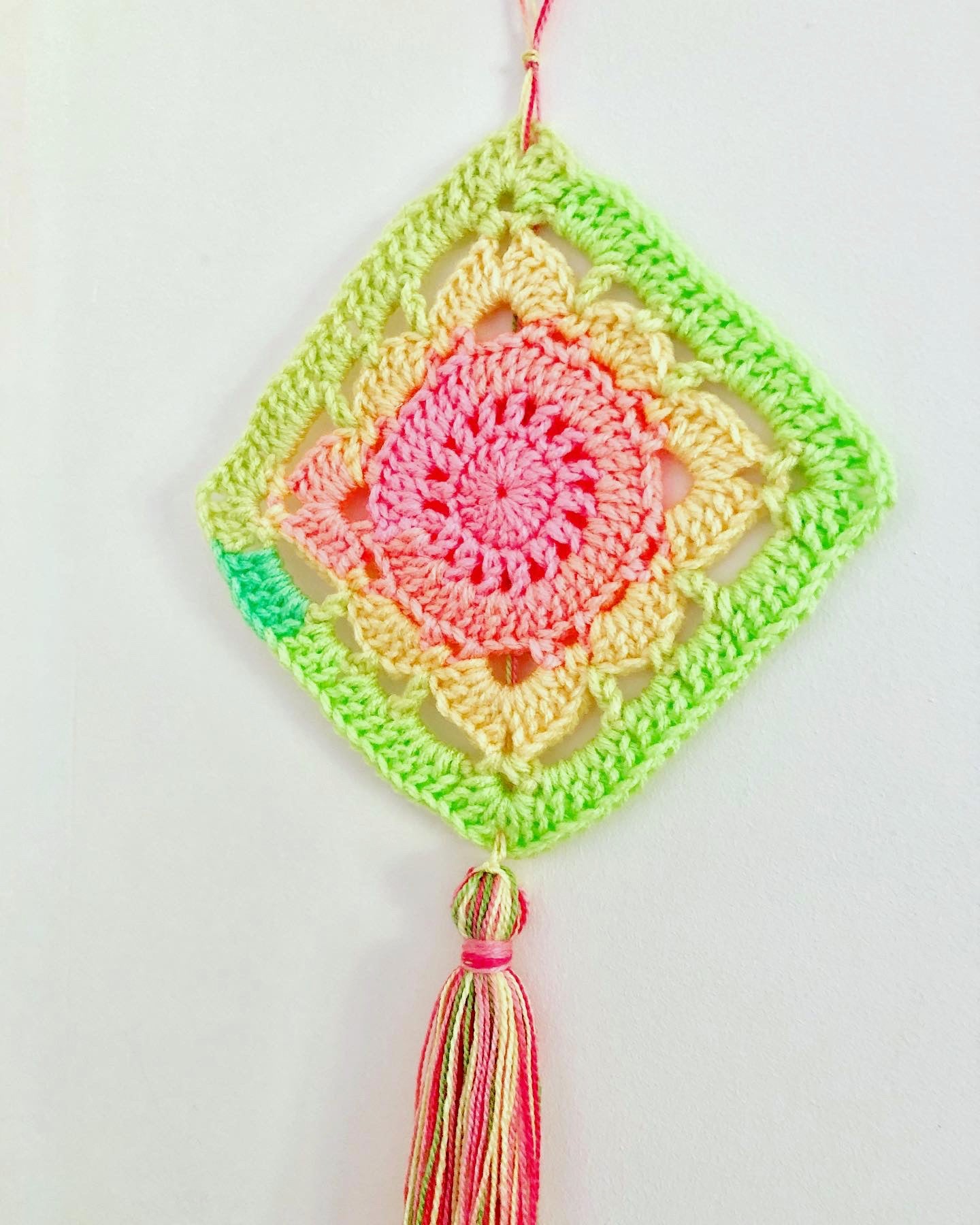 Suspension murale composée d'un losange ajouré, crocheté à la main, en laine 100 % acrylique et d'un grand pompon en fils coton.
